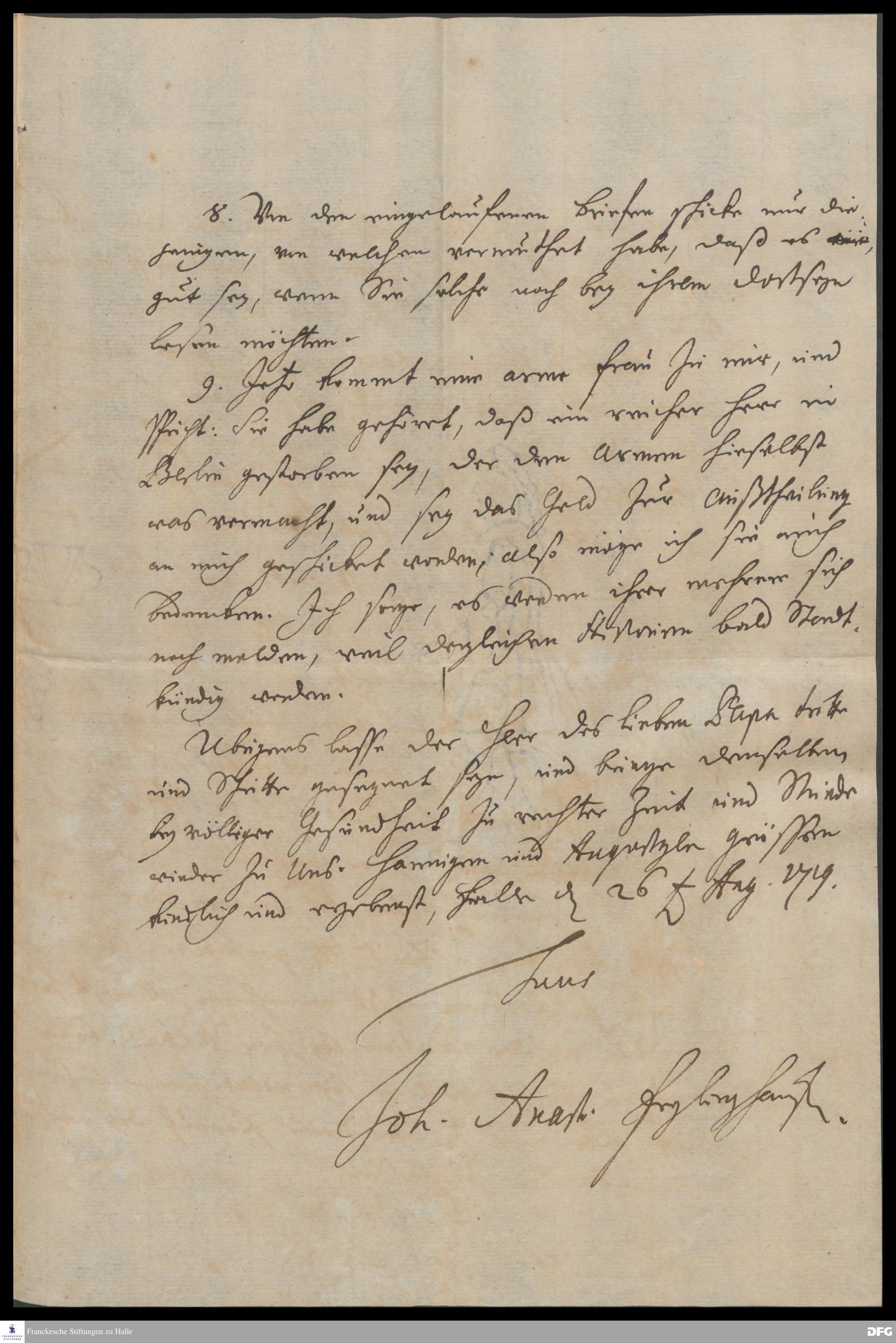 Brief von Johann Anastasius Freylinghausen an August Hermann Francke.
