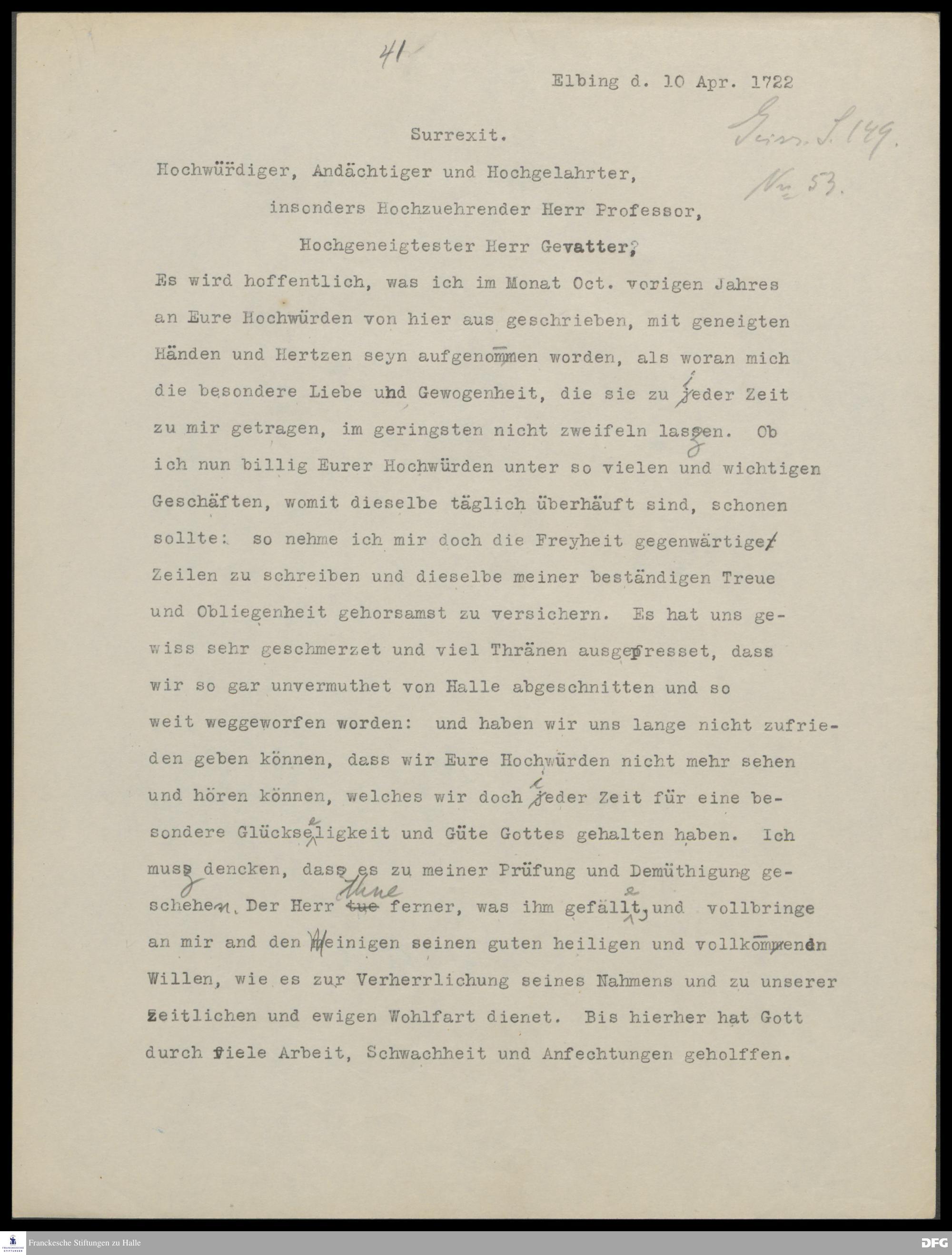Brief von Johann Michael Hempel an August Hermann Francke.