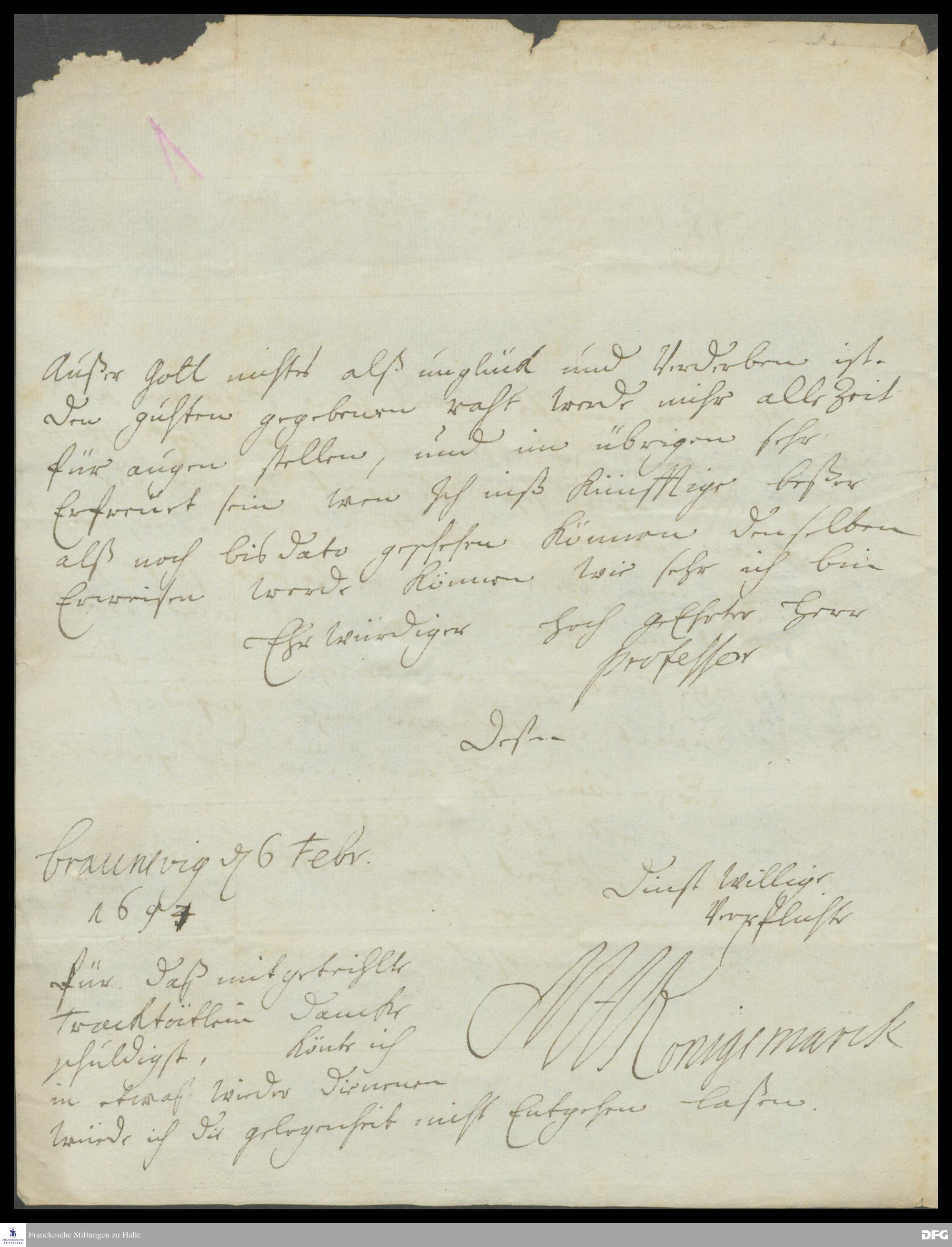 Brief von Maria Aurora v. Königsmarck an August Hermann Francke.