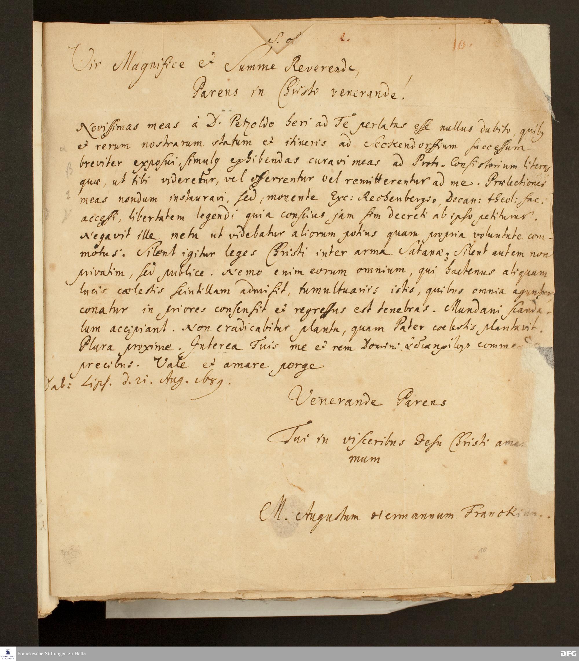 Brief von August Hermann Francke an Philipp Jakob Spener.