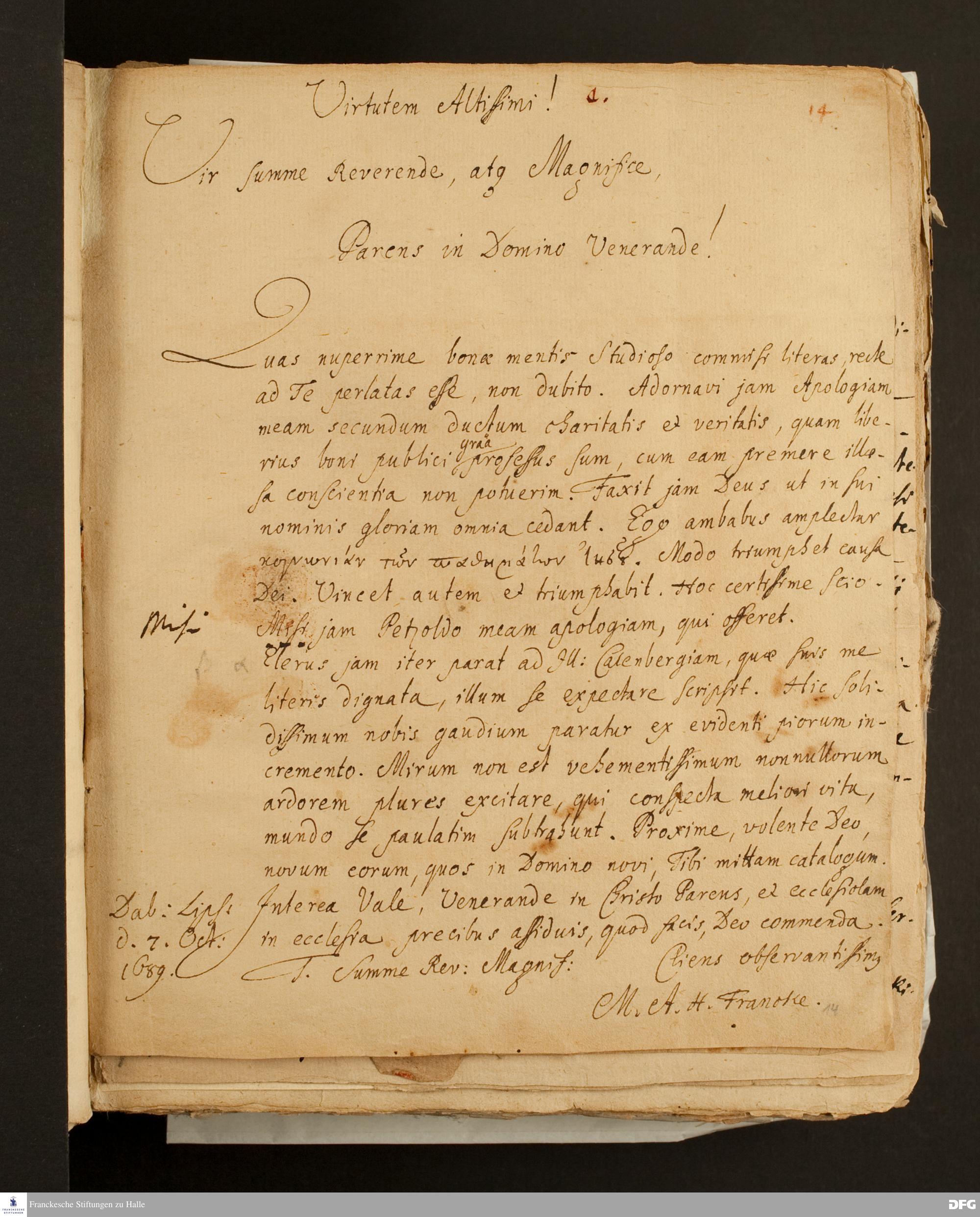 Brief von August Hermann Francke an Philipp Jakob Spener.