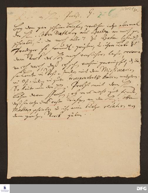 Notiz von August Hermann Francke für Bartholomäus Ziegenbalg.