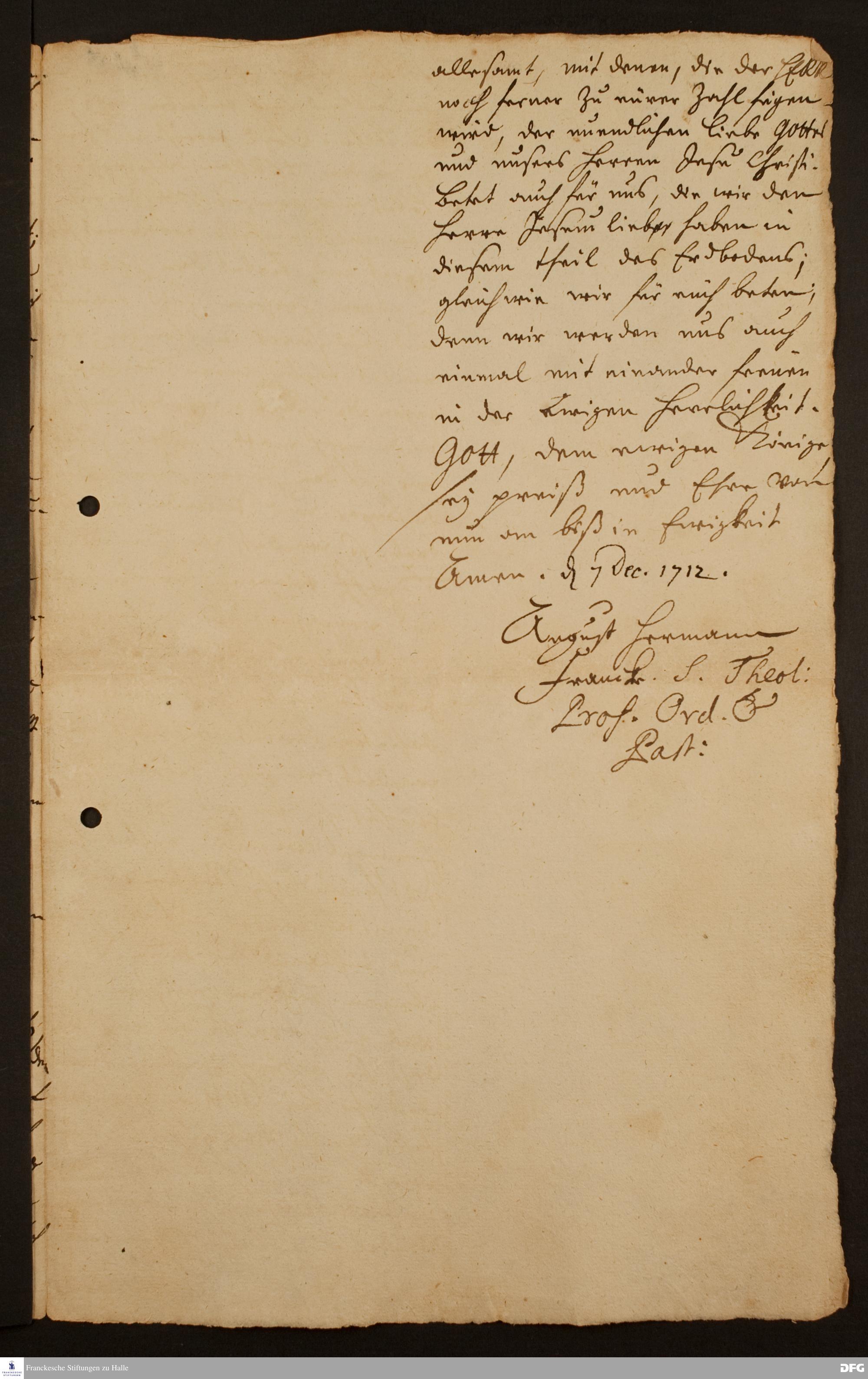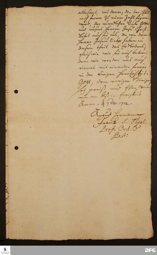 Brief von August Hermann Francke an die Jerusalem Gemeinde in Tranquebar.