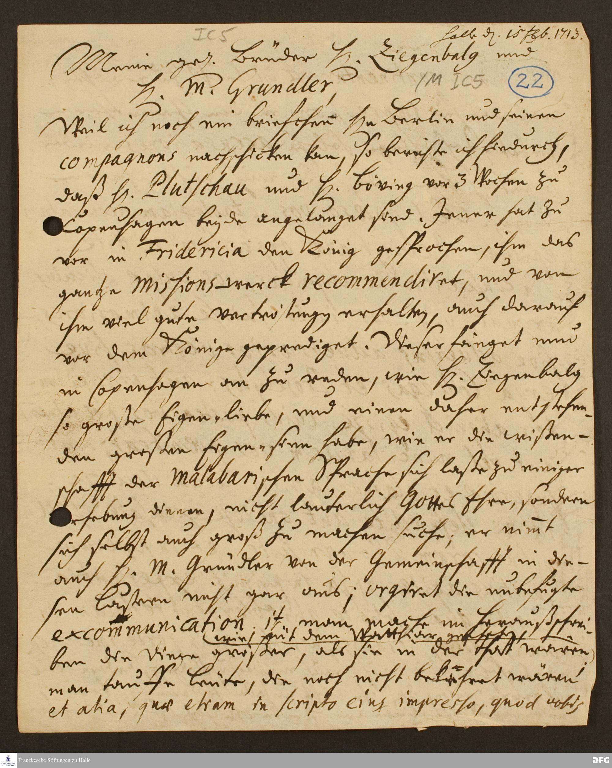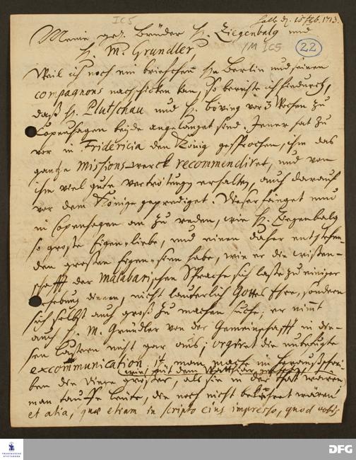 Brief von August Hermann Francke an Bartholomäus Ziegenbalg und Johann Ernst Gründler.