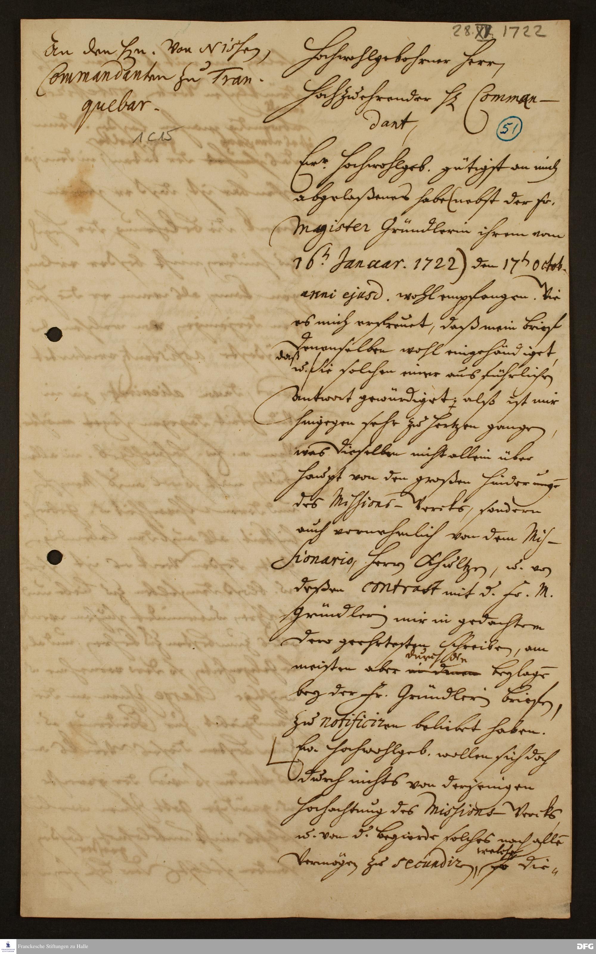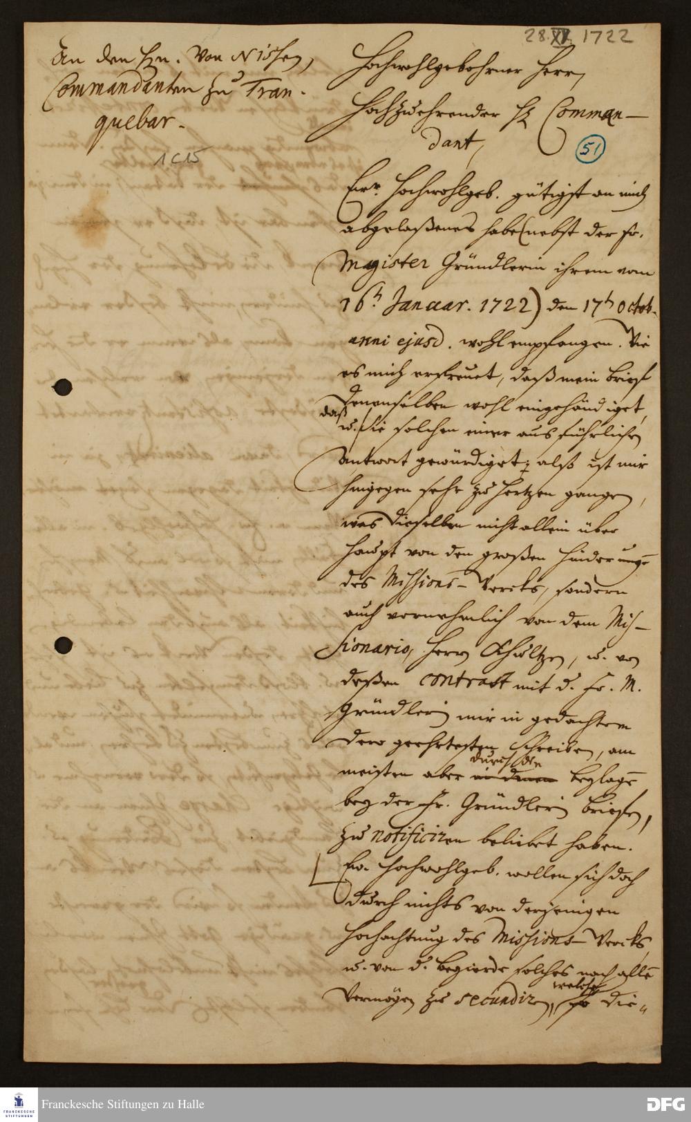 Brief von August Hermann Francke an Christian Ulrich v. Nissen.
