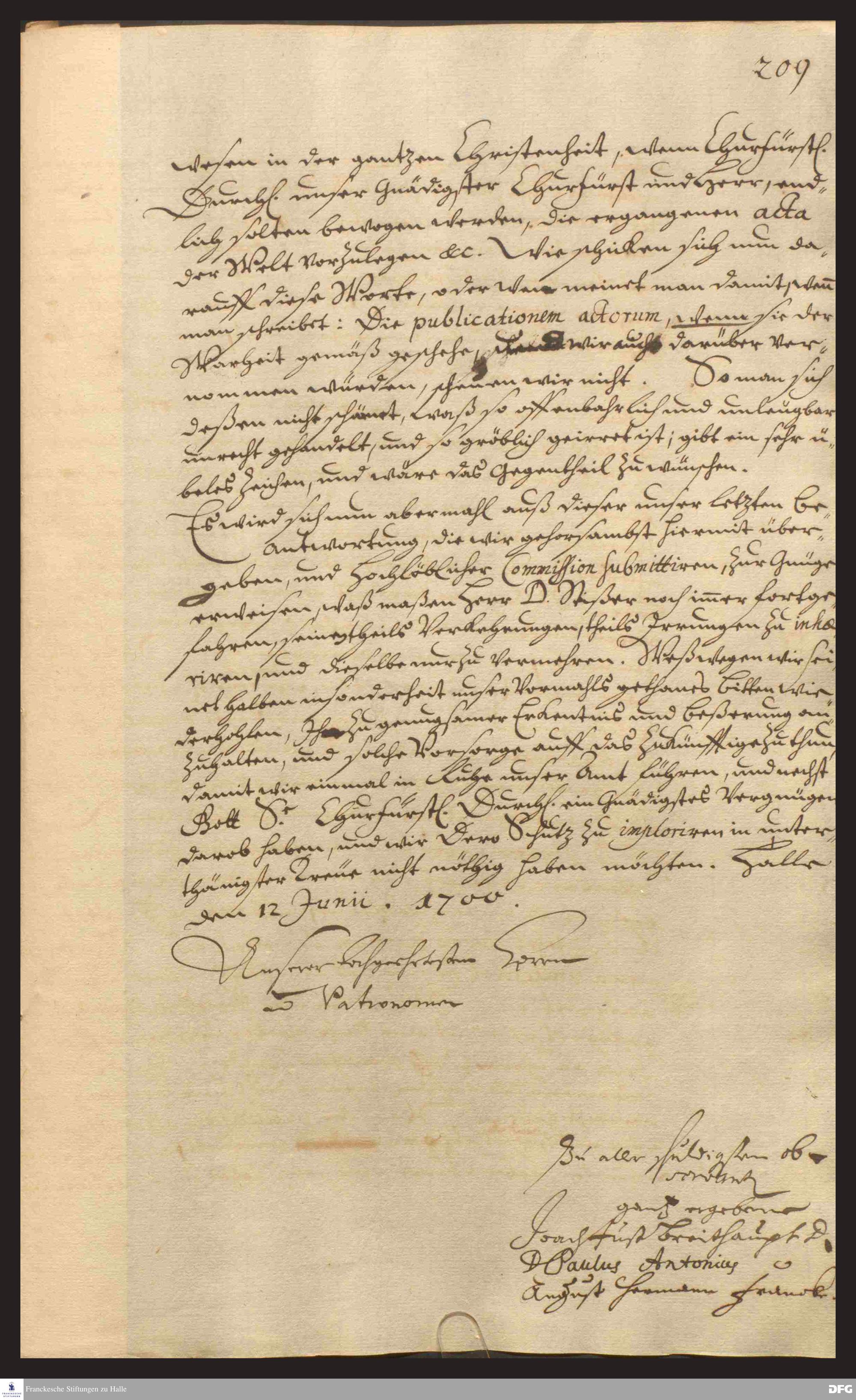 Brief von August Hermann Francke, Joachim Justus Breithaupt und Paul Anton an die Kurfürstlich-Brandenburgische Kommission.
