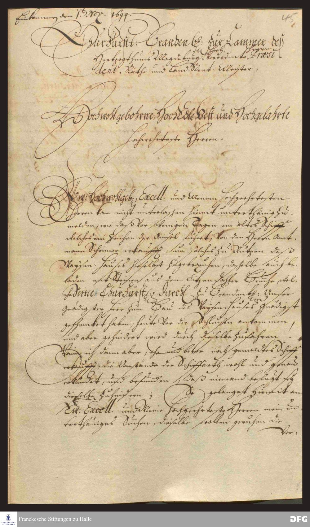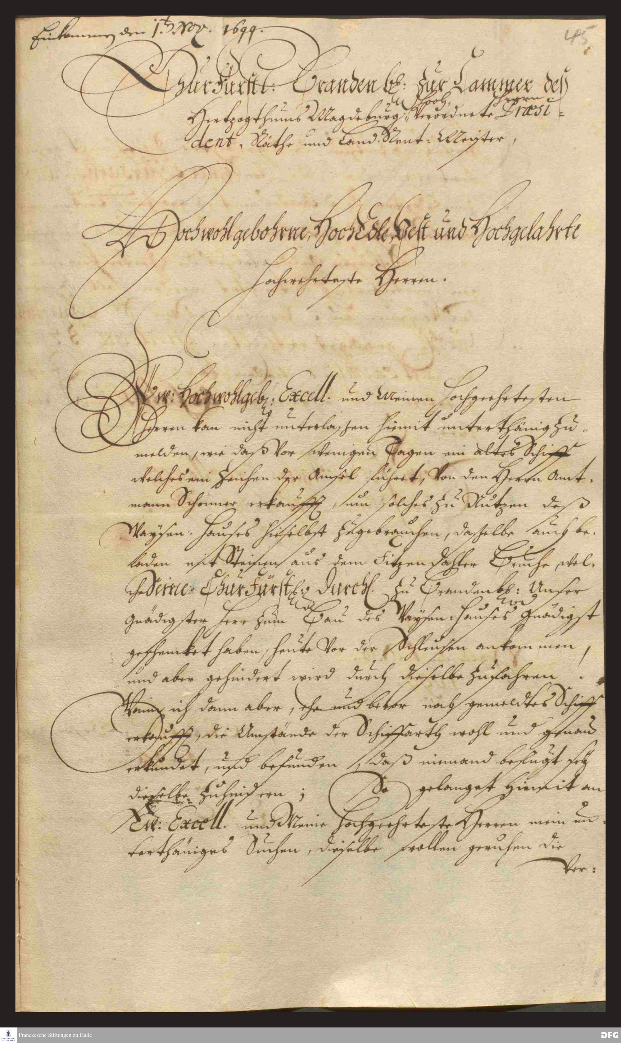 Brief von August Hermann Francke an die Kurfürstlich-Brandenburgische Kammer.