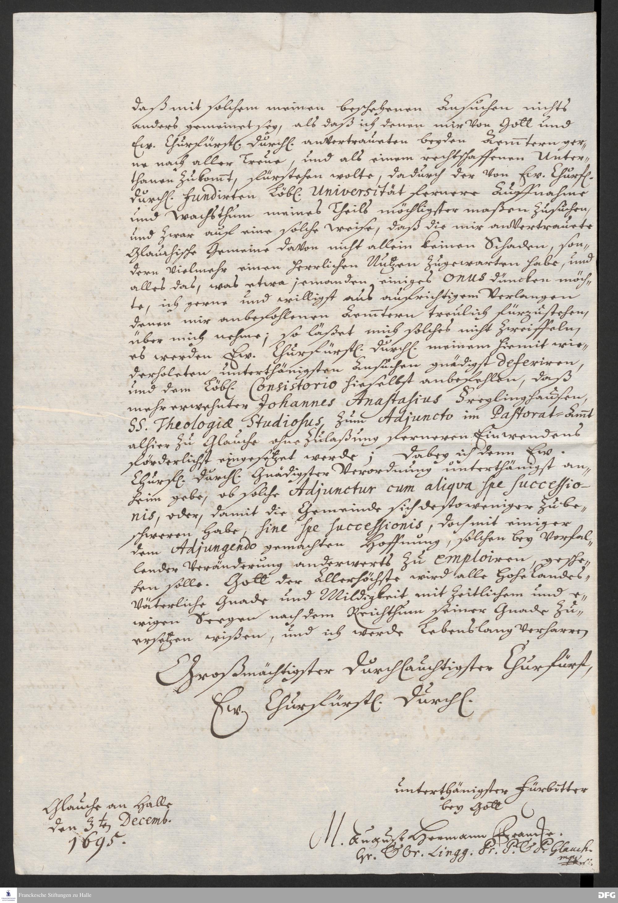 Brief von August Hermann Francke an Friedrich III., Kurfürst von Brandenburg.