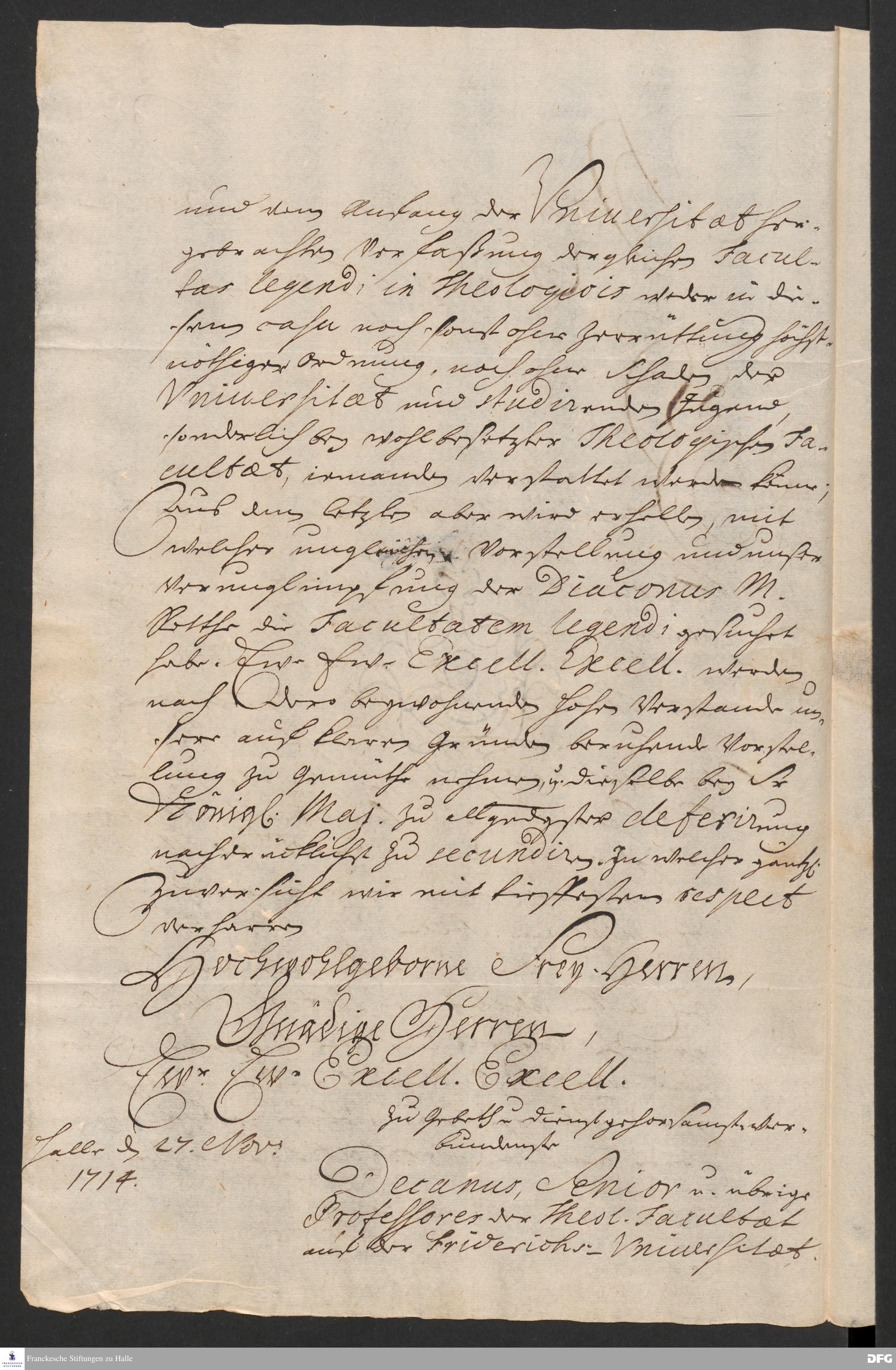 Brief von [August Hermann Francke, Joachim Just Breithaupt, Paul Anton, Johann Heinrich Michaelis und Joachim Lange] an Marquard Ludwig von Printzen und Johann Moritz von Blaspiel.