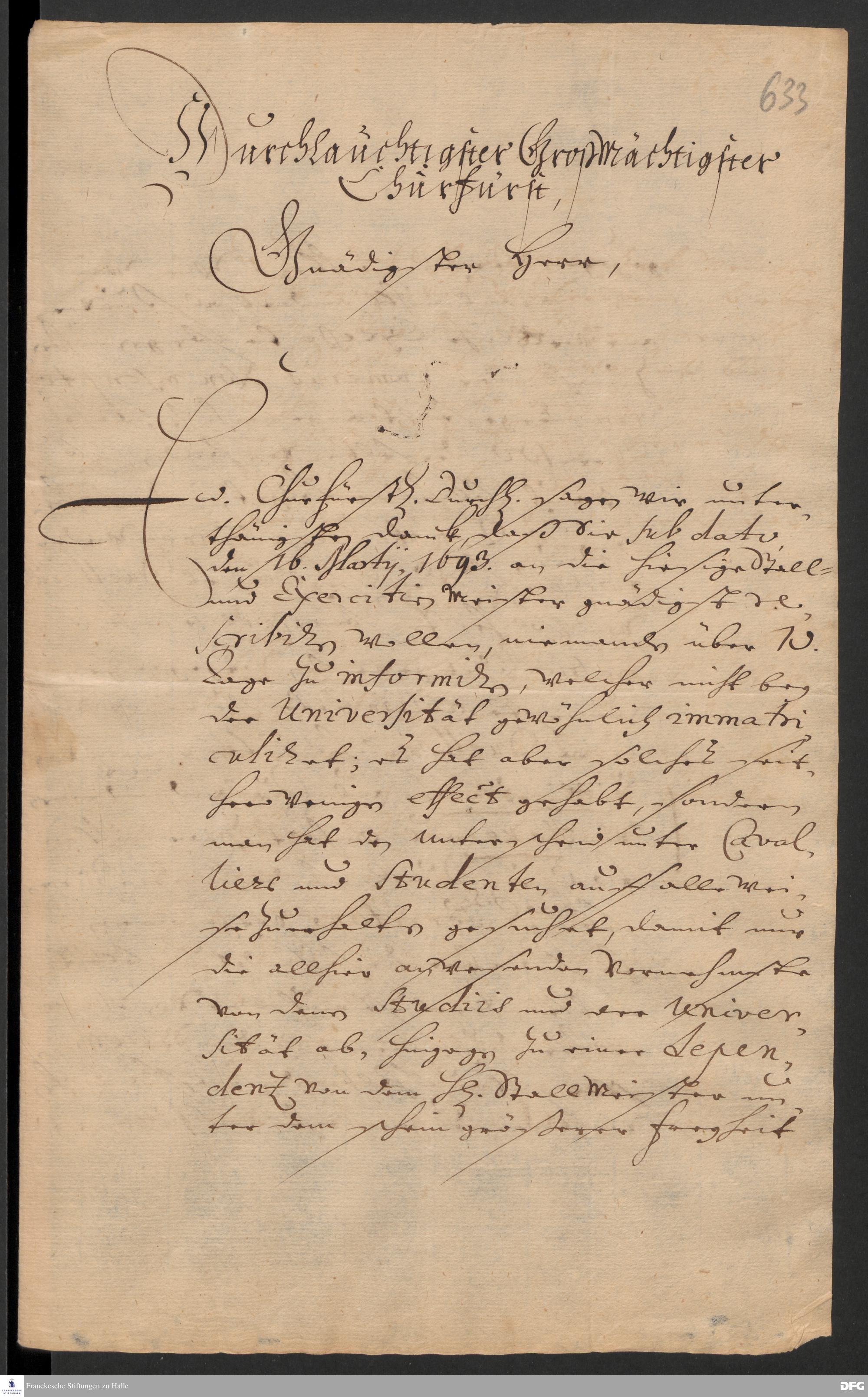 Brief von Samuel Stryk, Joachim Just Breithaupt, Christian Thomasius, Johann Georg Simon, Friedrich Hoffmann und August Hermann Francke an Friedrich III., Kurfürst von Brandenburg.