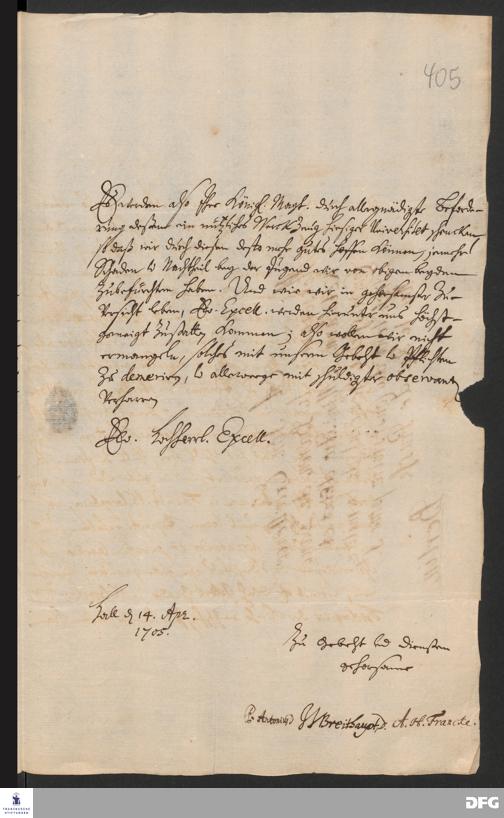 Brief von Joachim Just Breithaupt, Paul Anton und August Hermann Francke an Marquard Ludwig von Printzen.