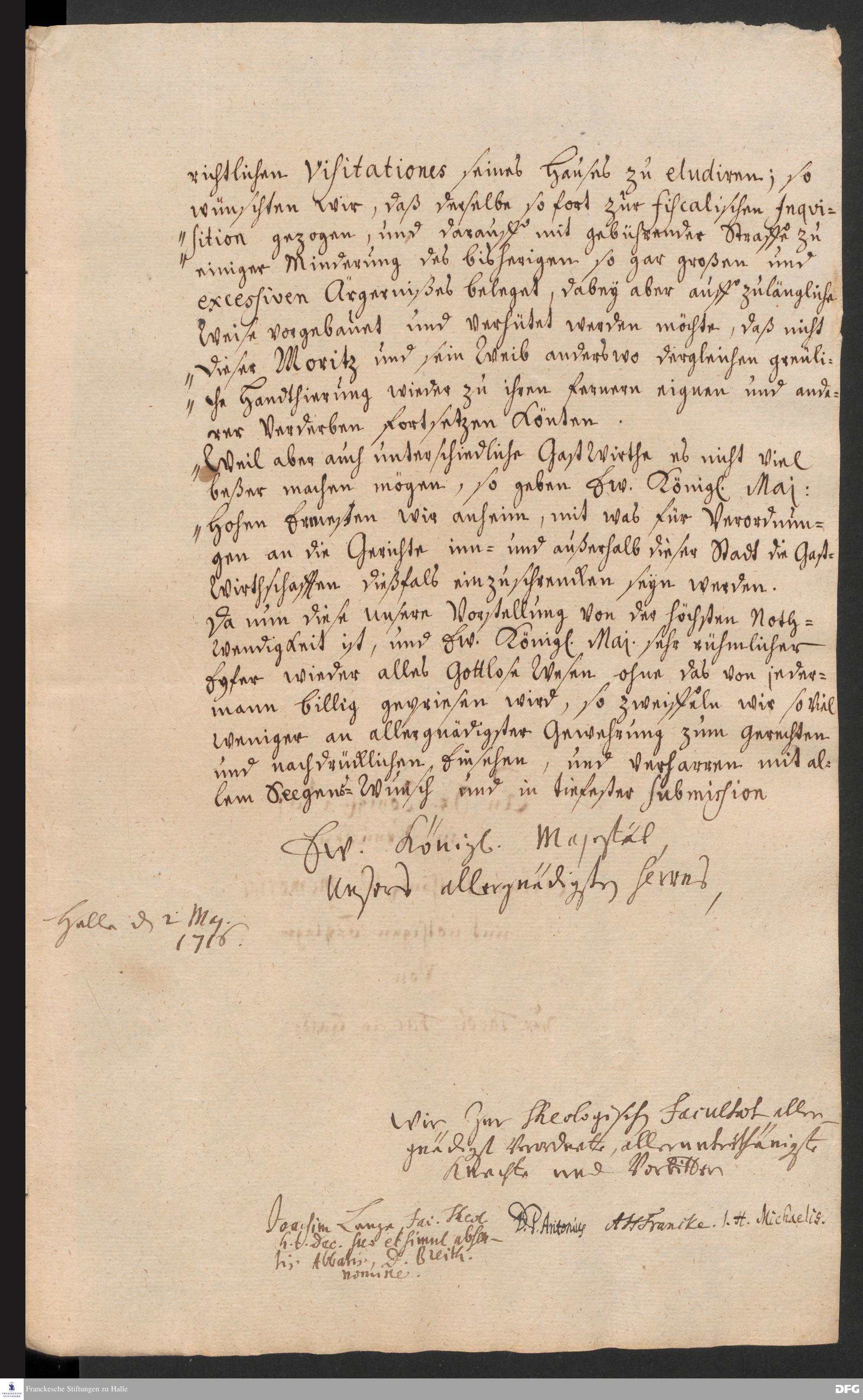 Brief von Joachim Lange, Joachim Just Breithaupt, Paul Anton, August Hermann Francke und Johann Heinrich Michaelis an Friedrich Wilhelm I., König in Preußen.