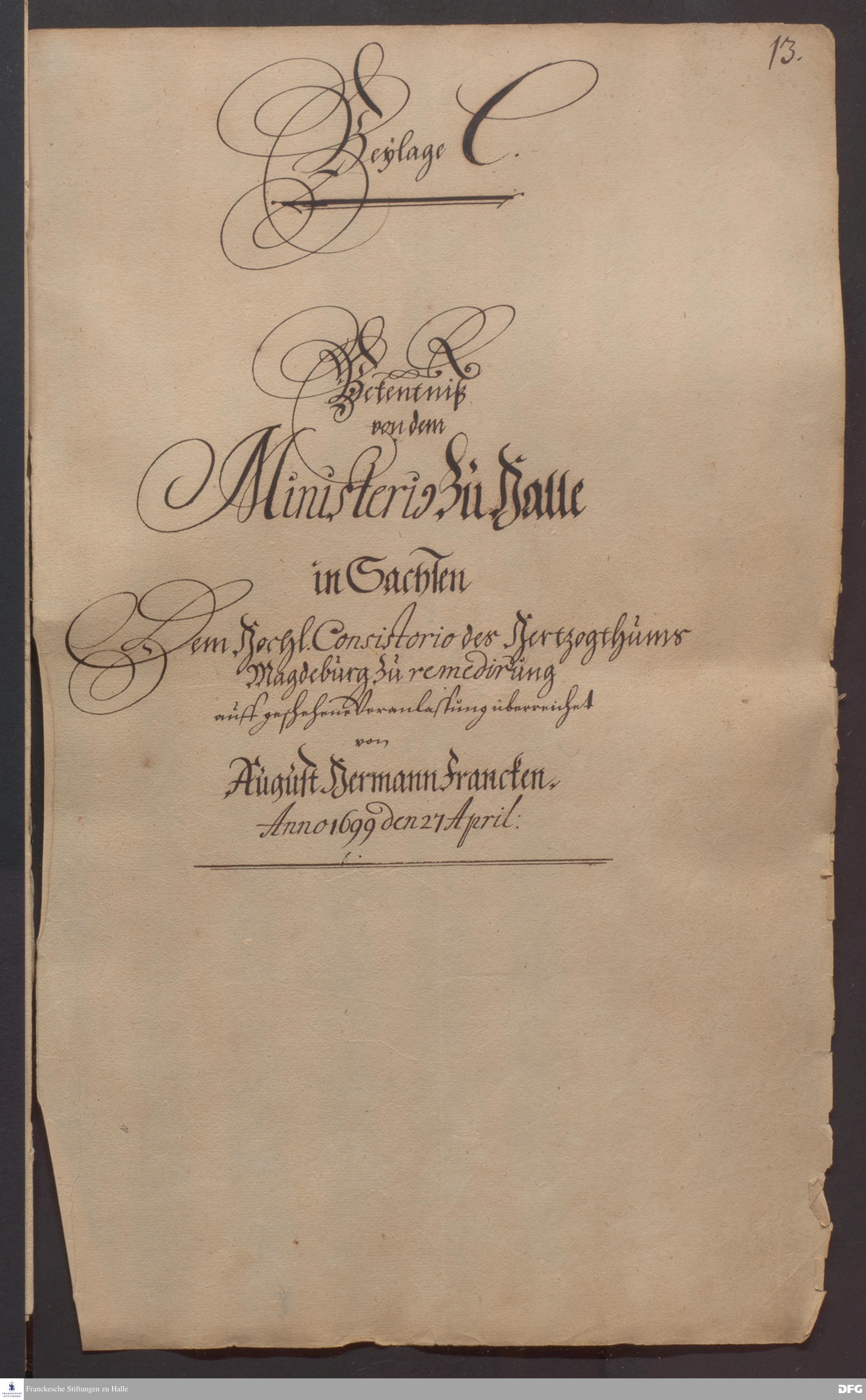 Brief von August Hermann Francke an die kurfürstlich brandenburgische Regierung und das Konsistorium Magdeburg.