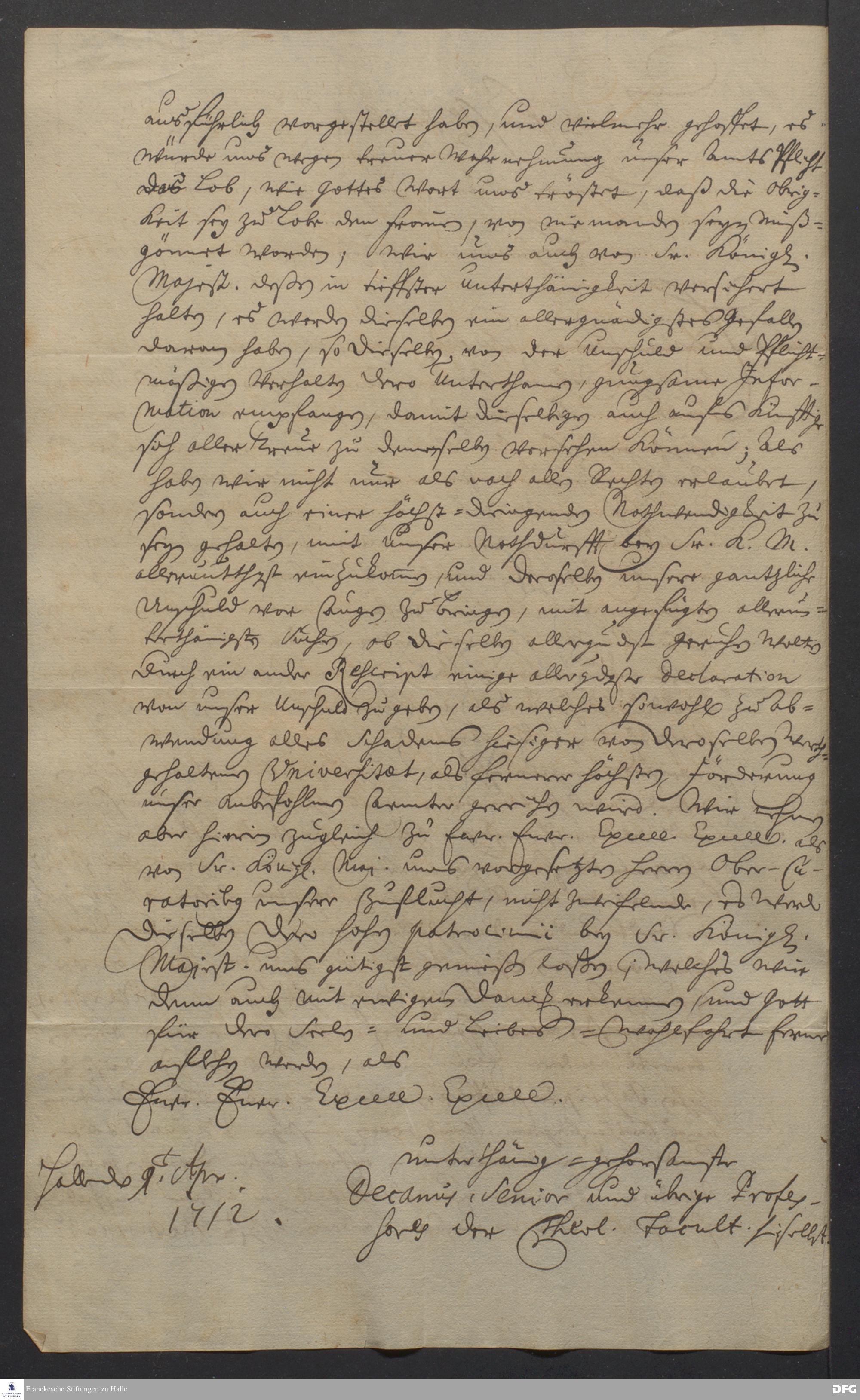 Brief von [August Hermann Francke, Paul Anton, Johann Heinrich Michaelis, Joachim Lange und Joachim Just Breithaupt] an [Marquard Ludwig von Printzen und Johan Moritz von Blaspiel].
