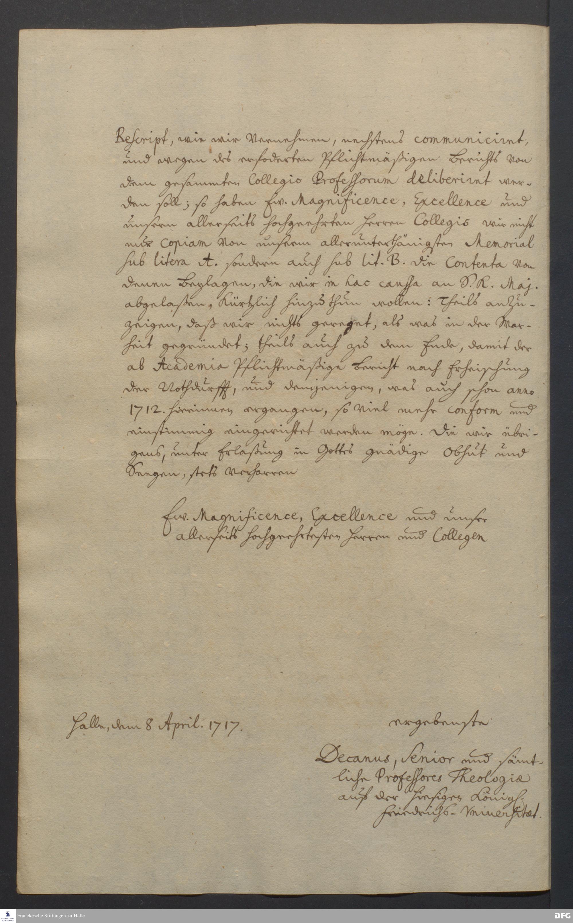 Brief der [Paul Anton, Johann Heinrich Michaelis, Joachim Lange, Johann Daniel Herrnschmidt] an August Hermann Francke und die Professoren der Universität Halle.