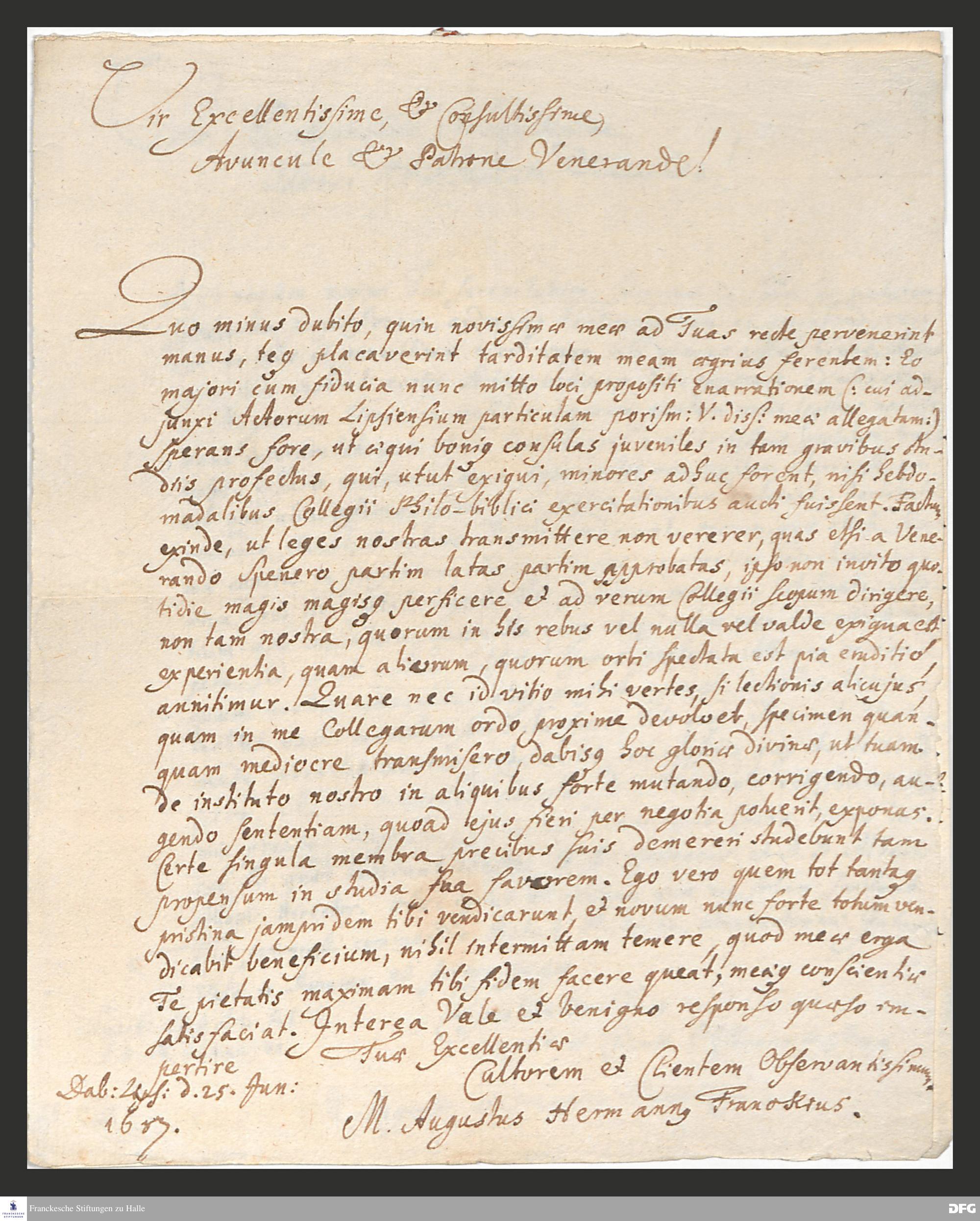 Brief von August Hermann Francke an Anton Hinrich Gloxin.