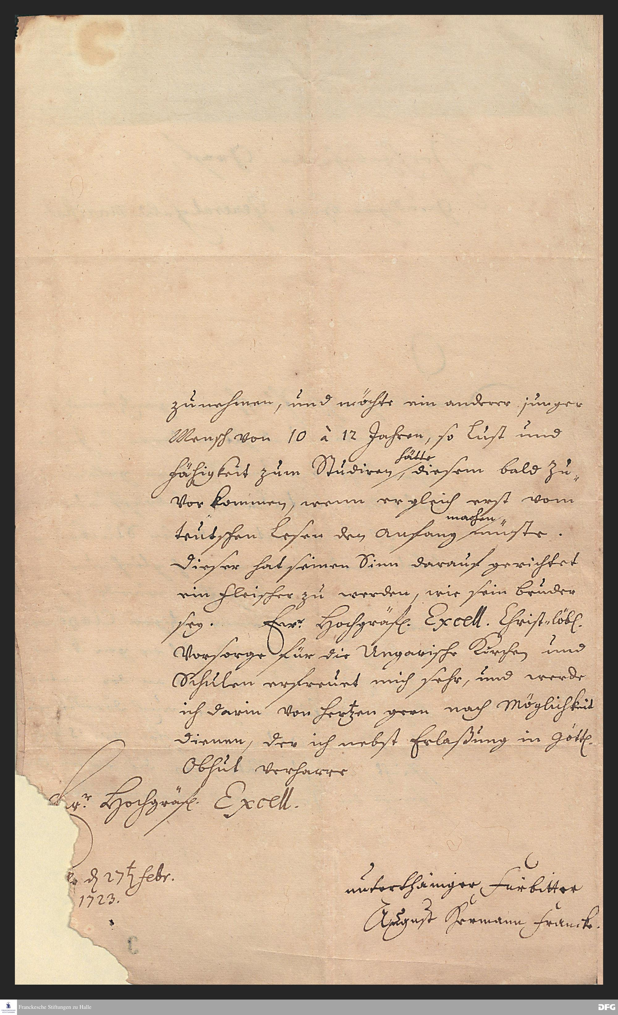 Brief von August Hermann Francke an Friedrich Heinrich von Seckendorff.