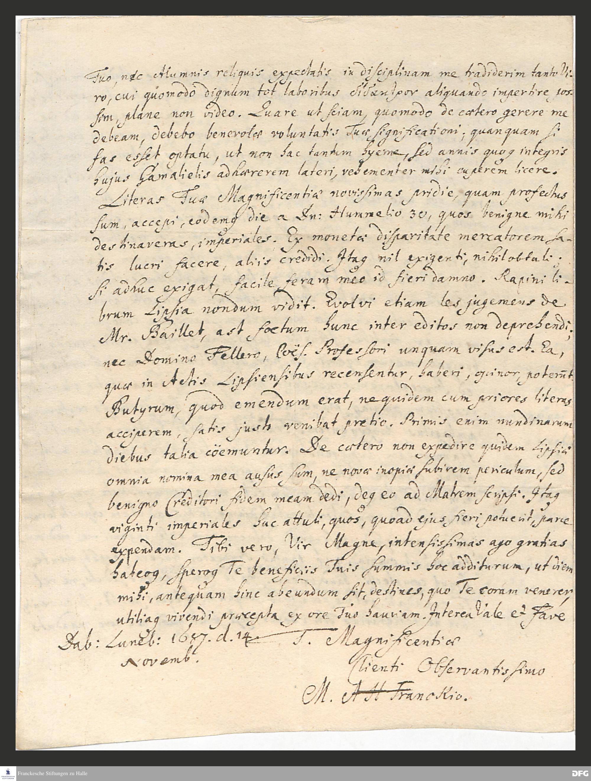 Brief von August Hermann Francke an Anton Hinrich Gloxin.