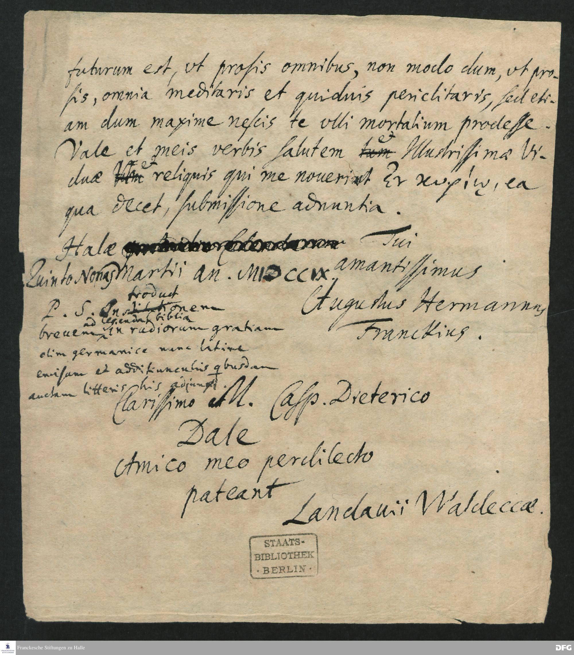 Brief von August Hermann Francke an Caspar Diedrich von Dahlen.