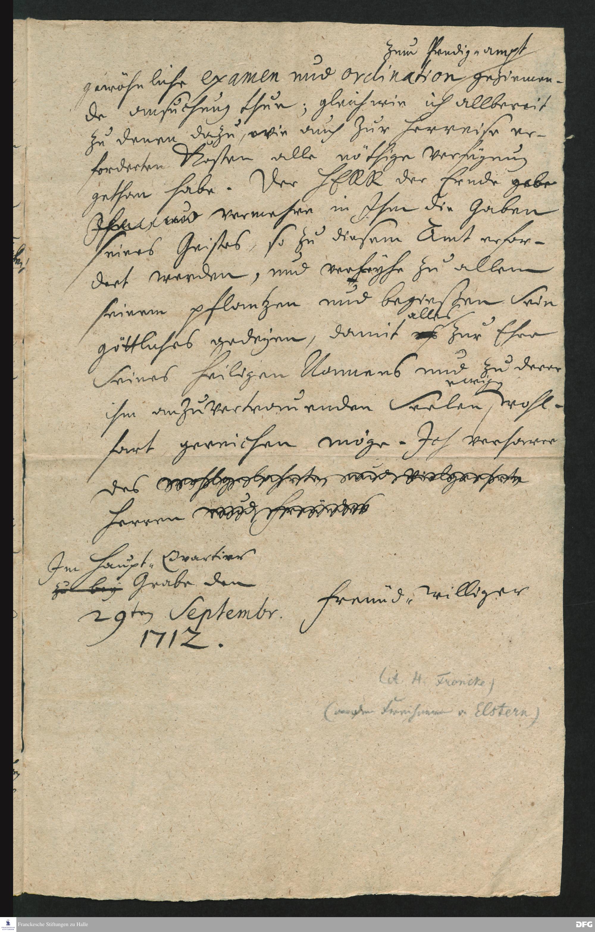 Brief von August Hermann Francke im Namen von Albrecht v. Elster an [Michael Wilhelm Liebermeister].