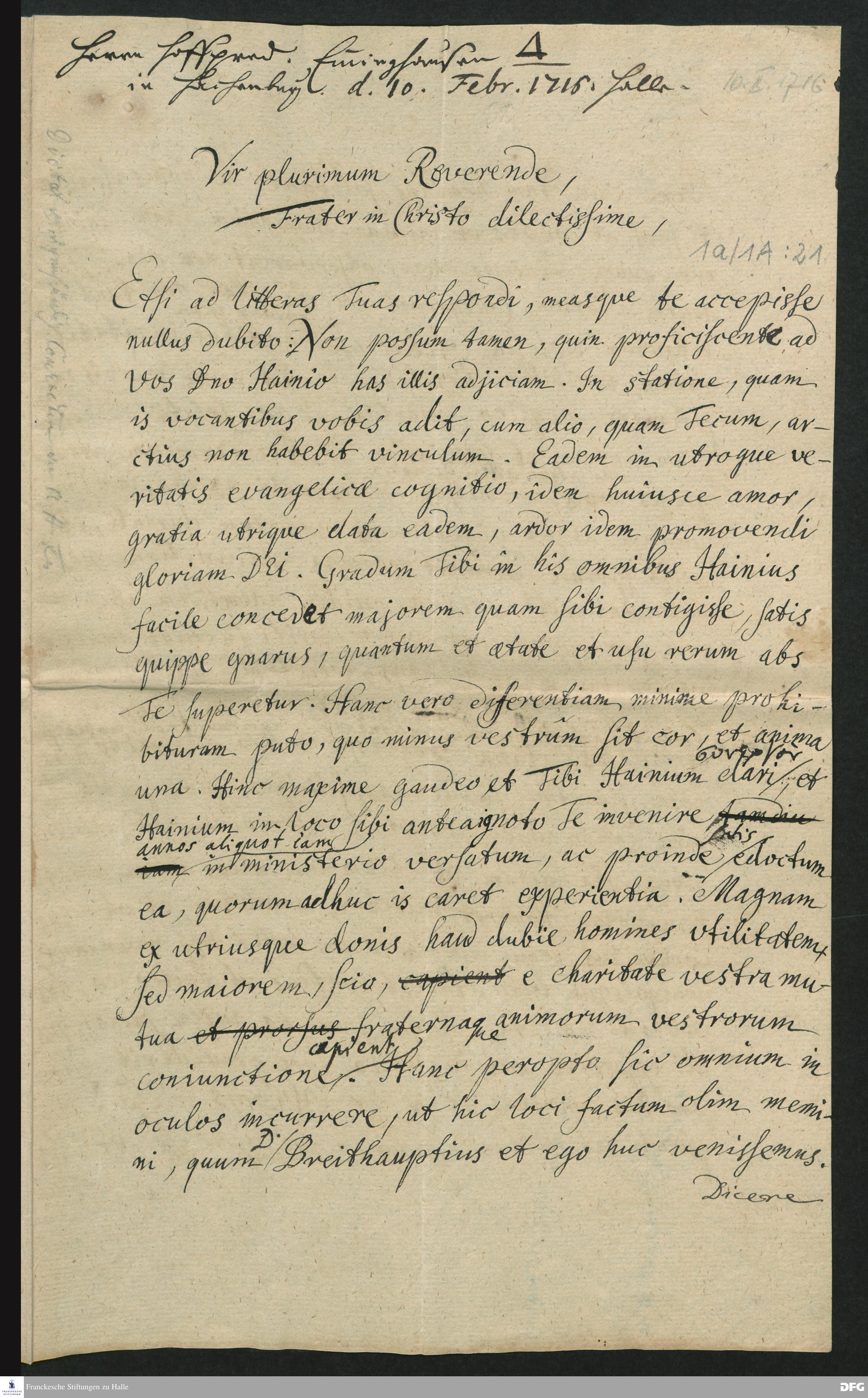 Brief von August Hermann Francke an Hofprediger Eininghausen.