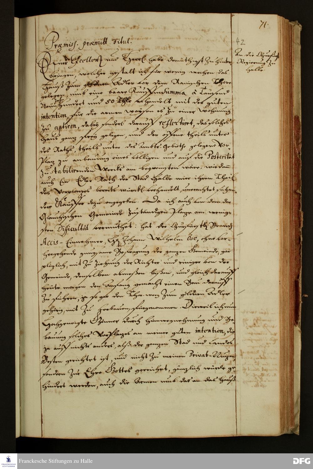 Brief von August Hermann Francke an die kurfürstliche Regierung in Halle.