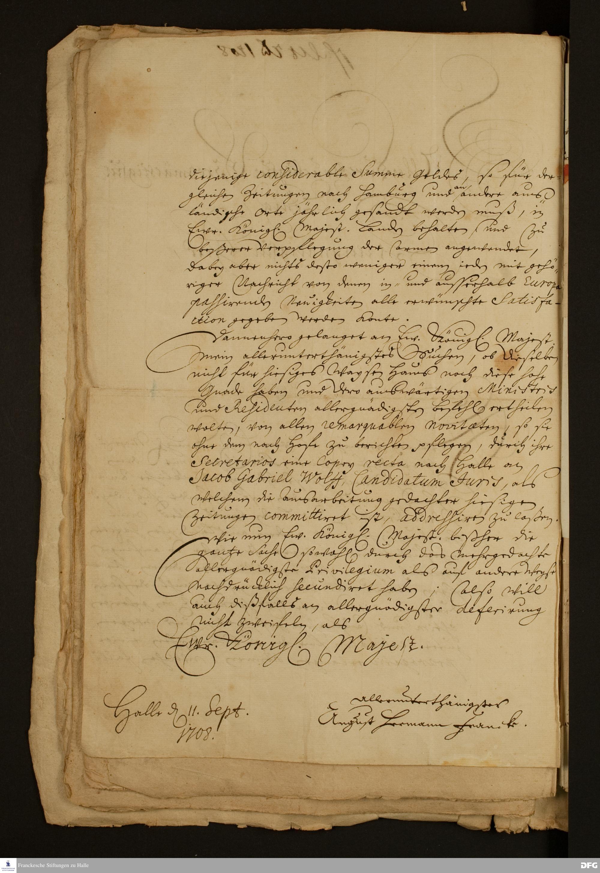 Brief von August Hermann Francke an Friedrich I., König in Preußen.