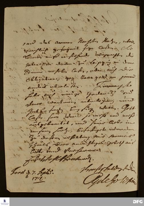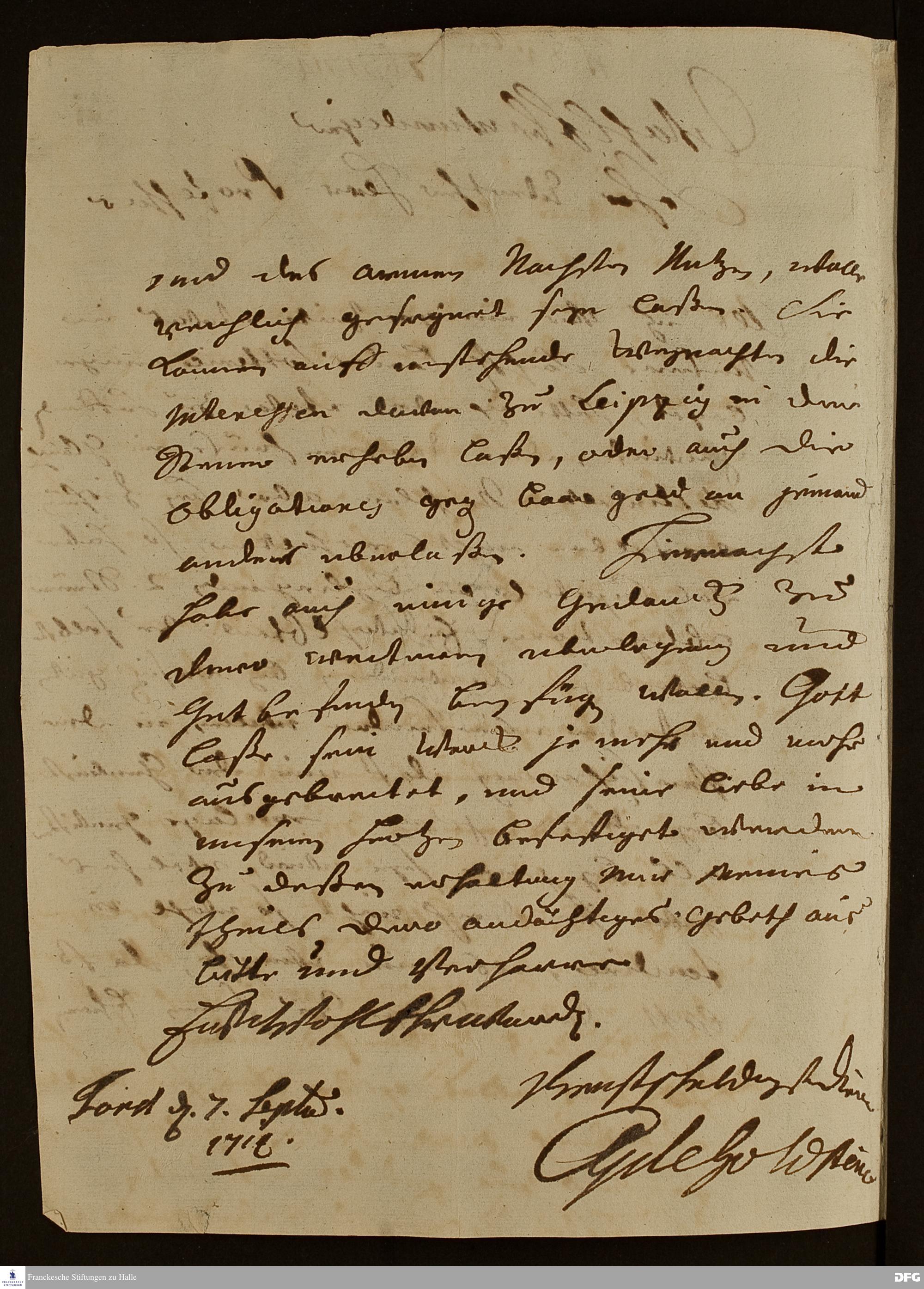 Brief von Carl Gottlob v. Goldstein an August Hermann Francke.