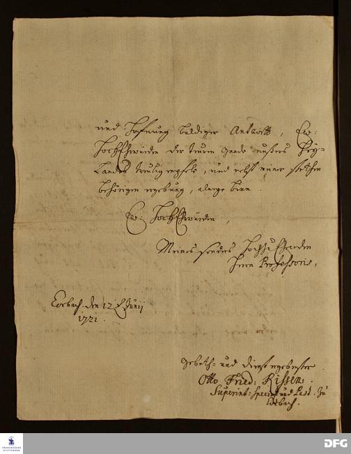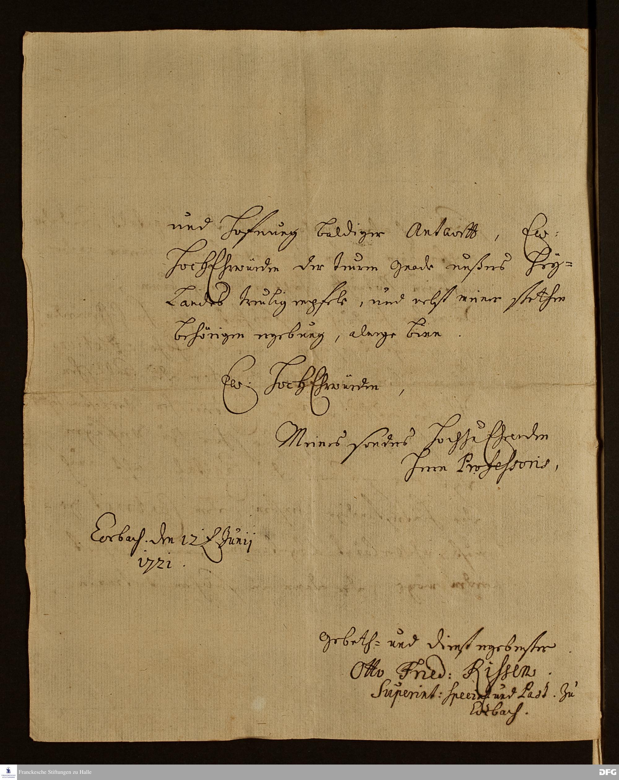 Brief von Otto Friedrich Rissen an August Hermann Francke.