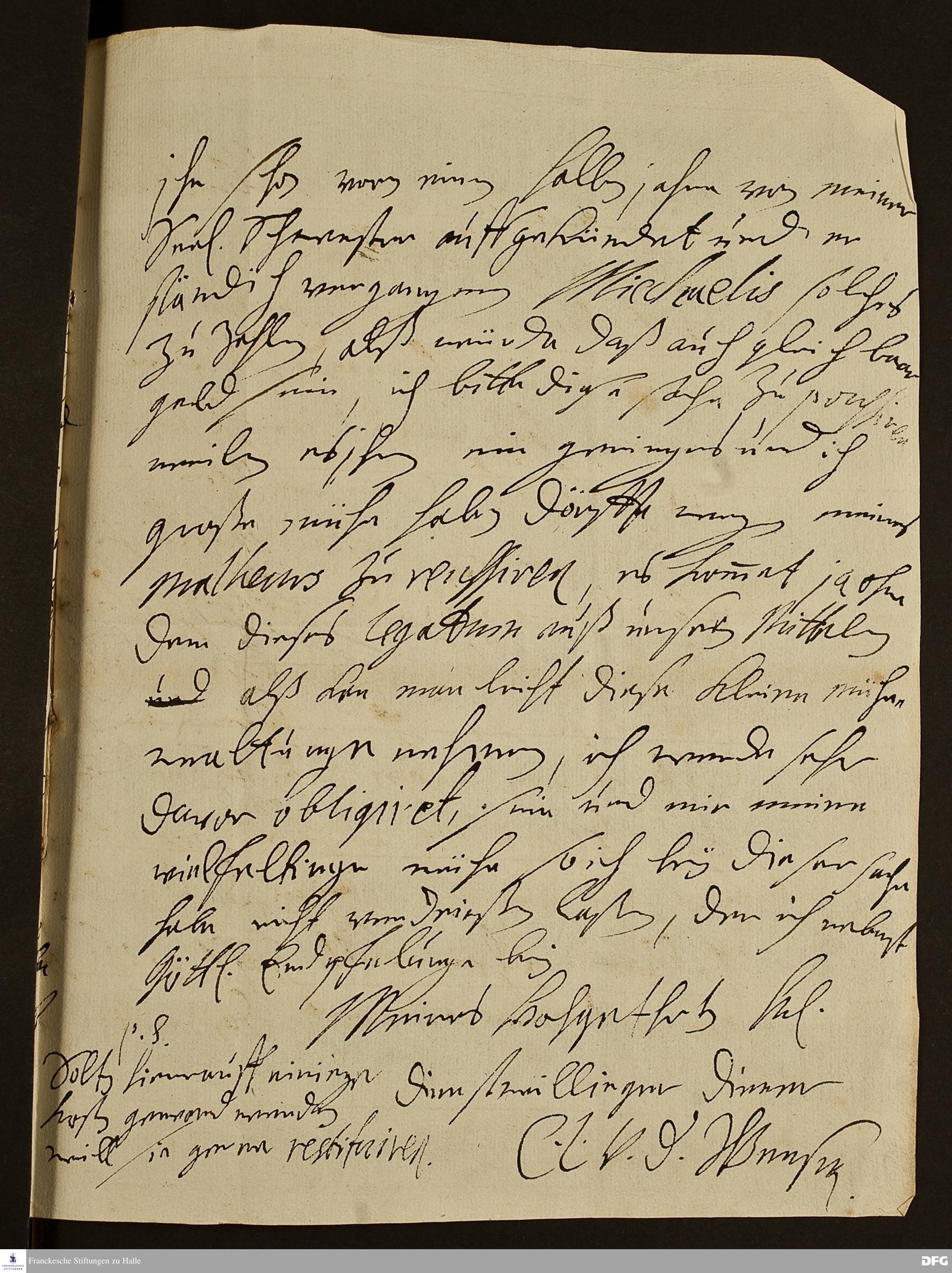 Brief von Christian Ludwig von der Wensen an August Hermann Francke.