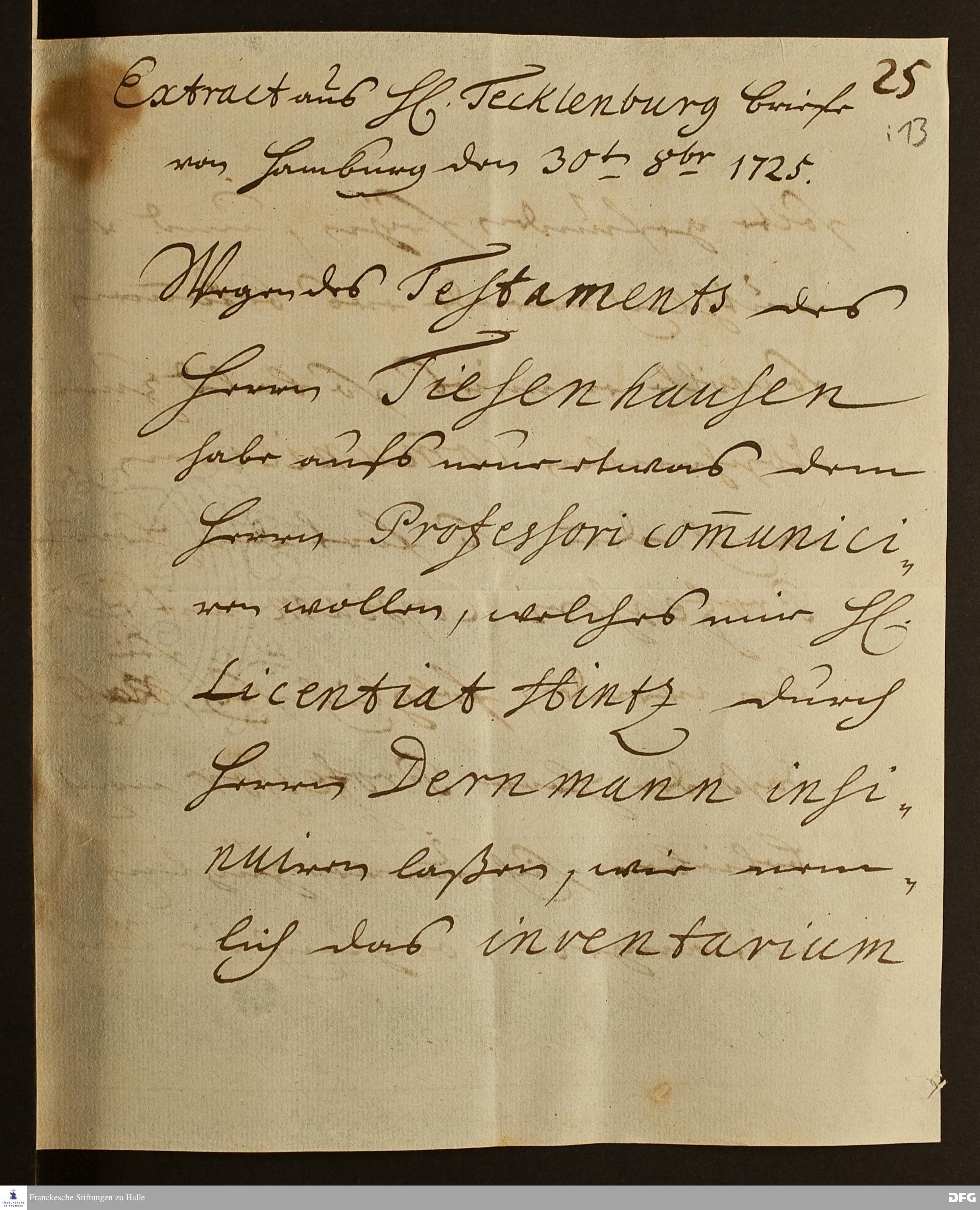 Auszug eines Briefes von Johann Baptista Tecklenburg an [August Hermann Francke].