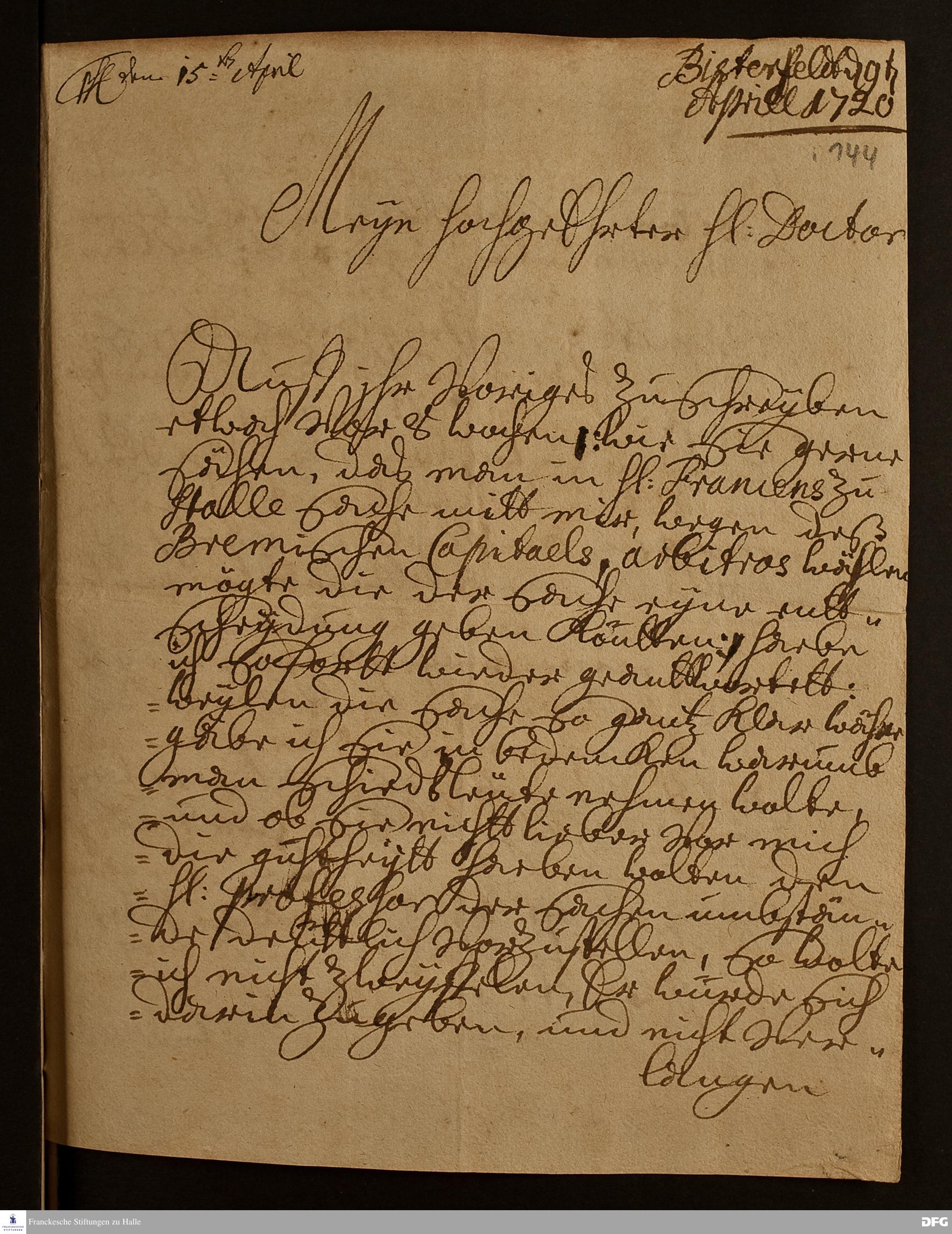 Brief von Rudolf Ferdinand zur Lipe-Biesterfeld an August Hermann Francke.