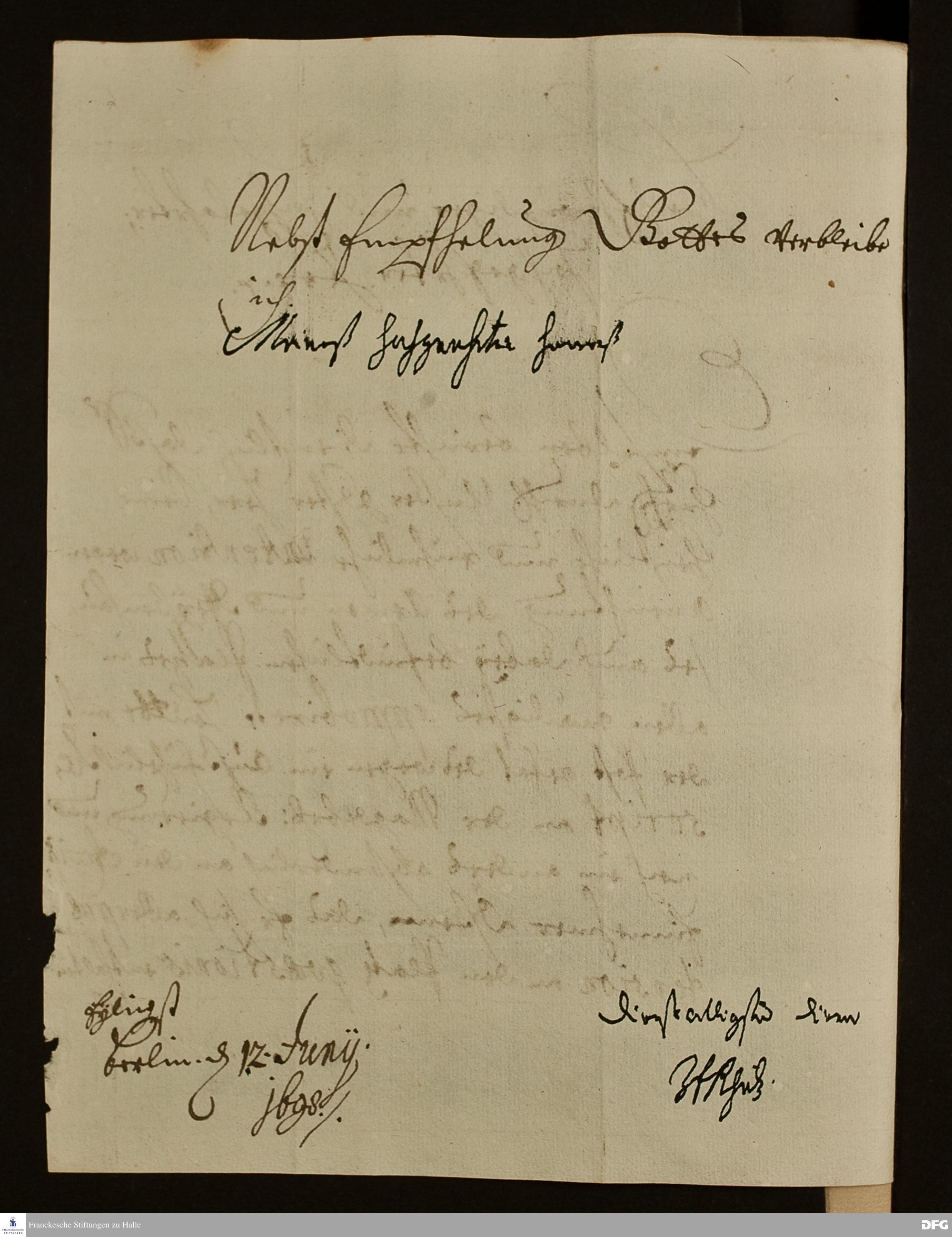 Brief von Johann Friedrich v. Rhetz an August Hermann Francke.