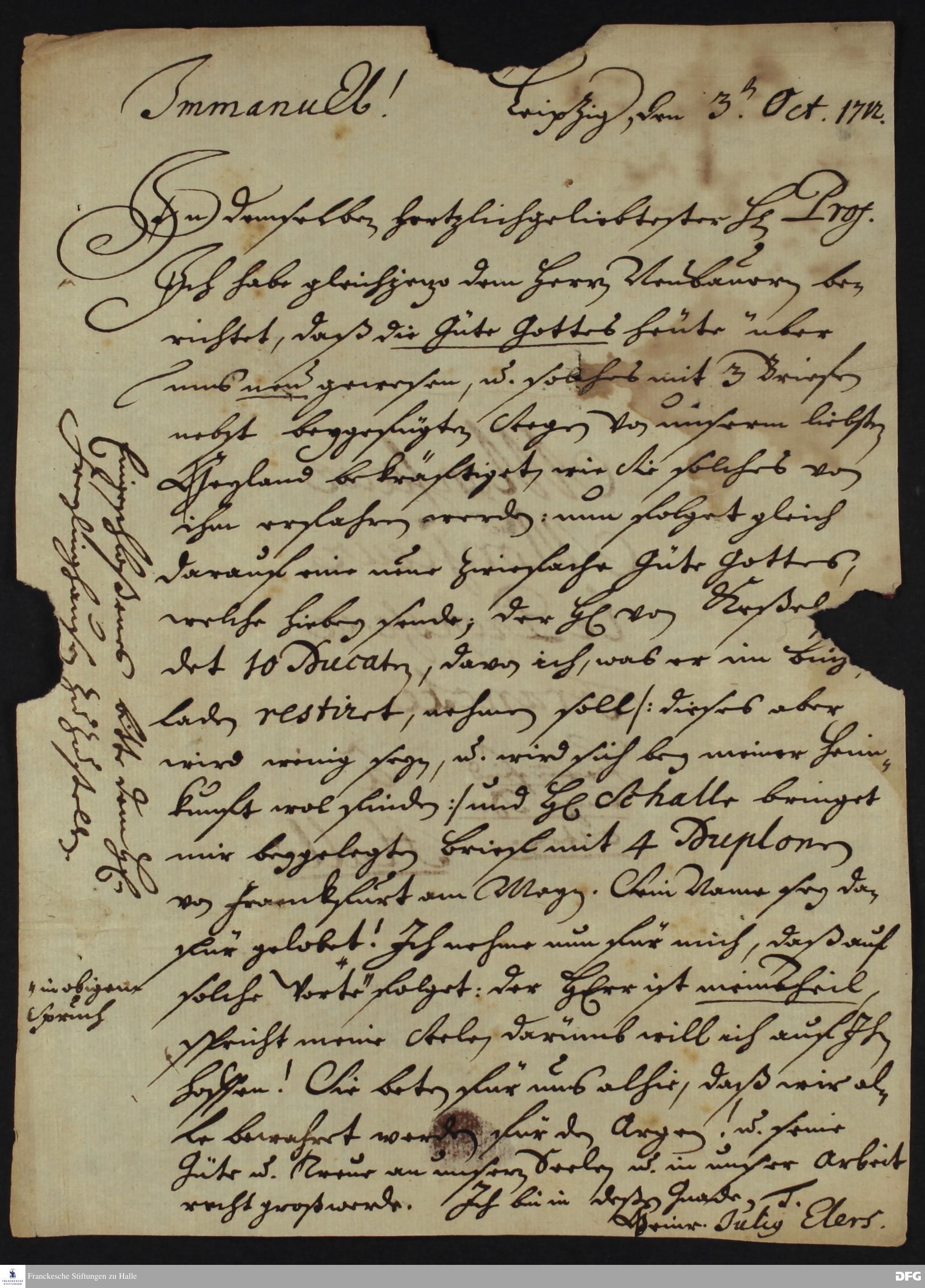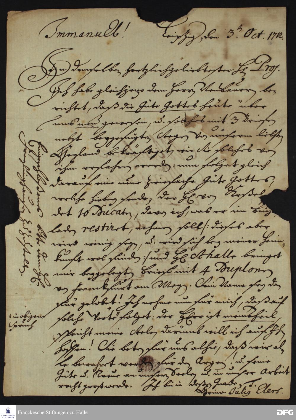 Brief von Heinrich Julius Elers an August Hermann Francke.