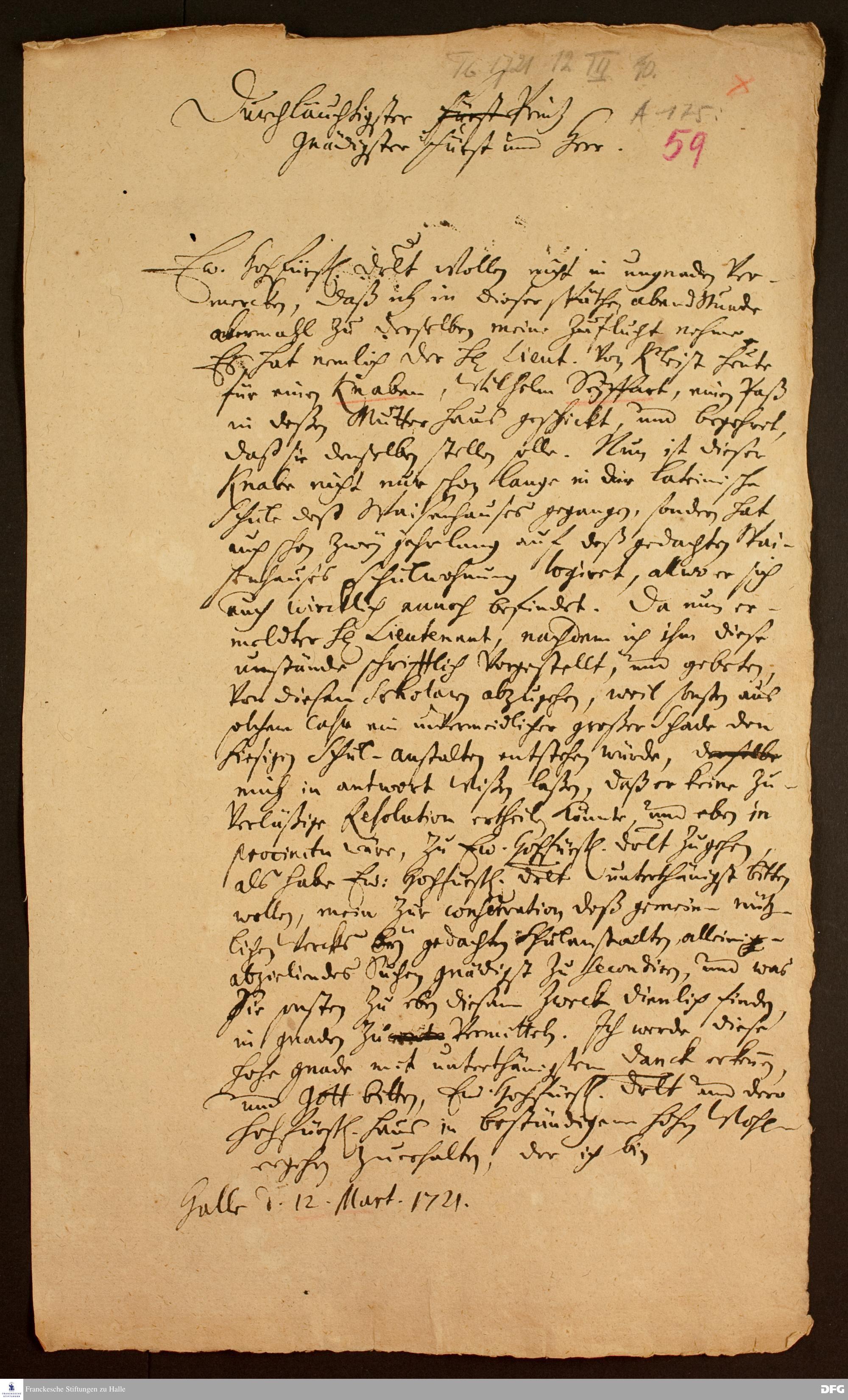 Brief von August Hermann Francke an Dietrich v. Anhalt-Dessau.