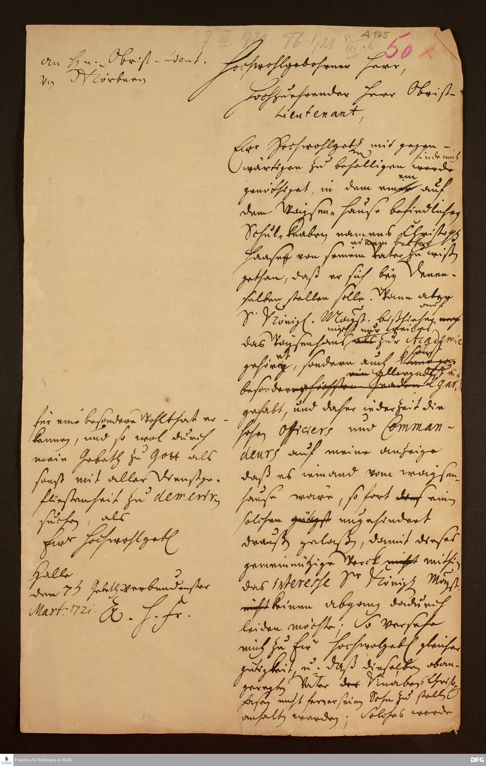 Brief von August Hermann Francke an Obristleutnant v. Körbner.