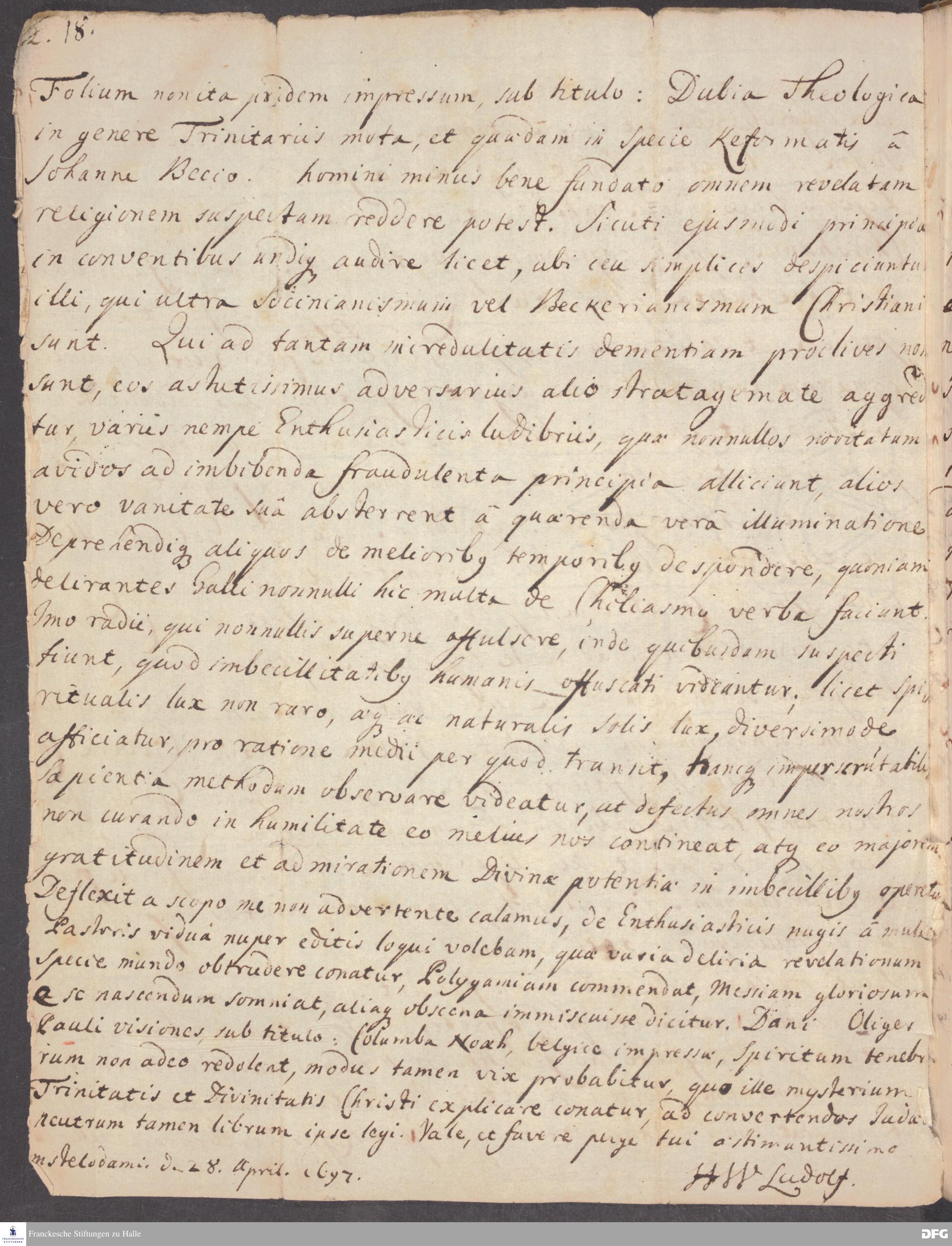 Brief von Heinrich Wilhelm Ludolf an August Hermann Francke.