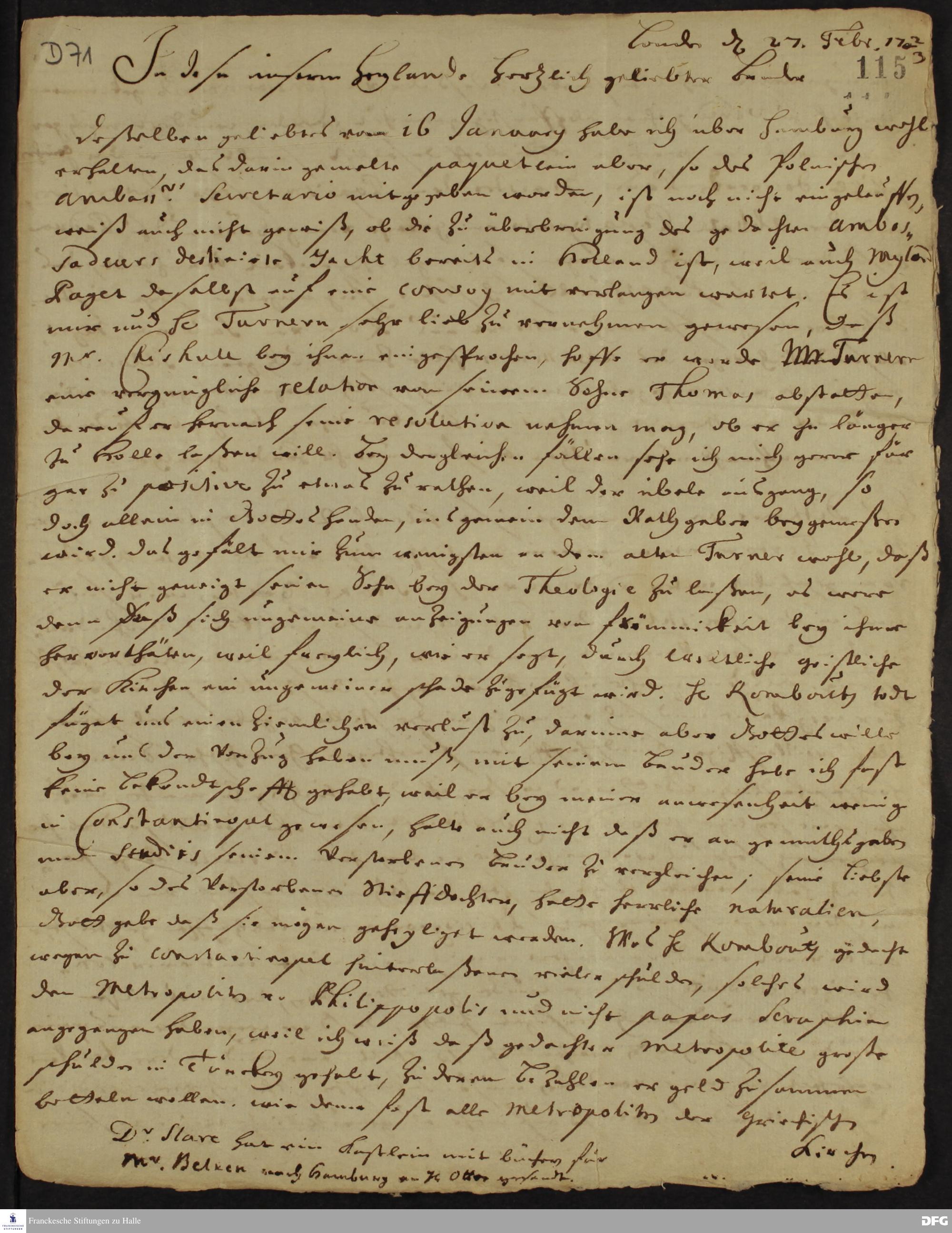 Brief von Heinrich Wilhelm Ludolf an August Hermann Francke.