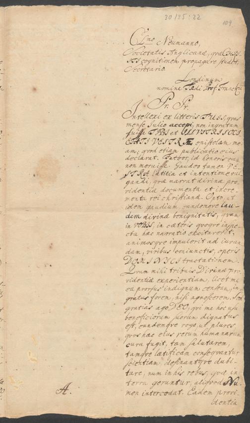 Francke dankt Newman für die Publikation seines Briefes durch die SPCK. Im Zusammenhang mit Rückschlägen bei der Indienmission zeigt er sich erkenntlich für Newmans Beistand in Wort und Tat. Er berichtet, er habe sich bereits um neue Kandidaten für die Reise nach Indien gekümmert und die Verantwortlichen in Dänemark kontaktiert. Im Zusammenhang mit der Erarbeitung eines arabischen Neuen Testaments gibt er einen Brief von [M. V.] La Croze wieder. Nach einem Bericht über seinen Vortrag in Jena über die Einrichtung von Bibelkollegien an den Universitäten sowie die Edierung der Werke [M.] Luthers, geht er auf verschiedene neue Waisenhäuser, u. a. die in Züllichau und in Livland, ein. Im Zusammenhang mit dem letzteren zitiert er ein längeres Schreiben des Bischofs von Pskow, [F.] Prokopowitsch. Am Schluß des Briefes gibt er auch eine umfangreichere lateinische Übersetzung der Vorrede sowie ausgewählter Absätze aus dessen russischem Katechismus.