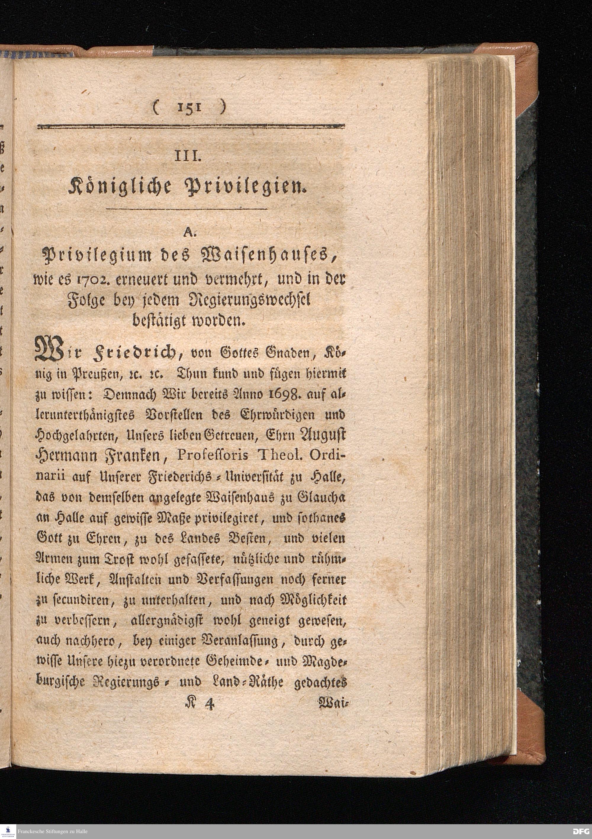 A. Privilegium des Waisenhauses, wie es 1702. erneuert und vermehrt, und in der Folge...