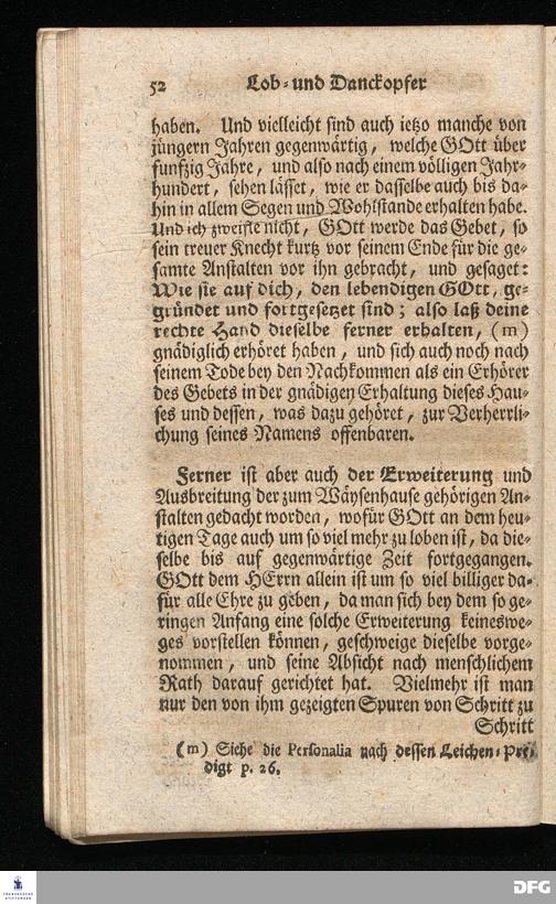 Schuldiges Lob- und Danck-Opfer für die Güte und Wohlthaten Gottes, so derselbe an dem Wäysenhause zu Glaucha an Halle seitdem der Grundstein zu demselben vor funfzig Jahren geleget worden, bis hieher reichlich erzeiget hat, den 24.sten Jul. 1748.