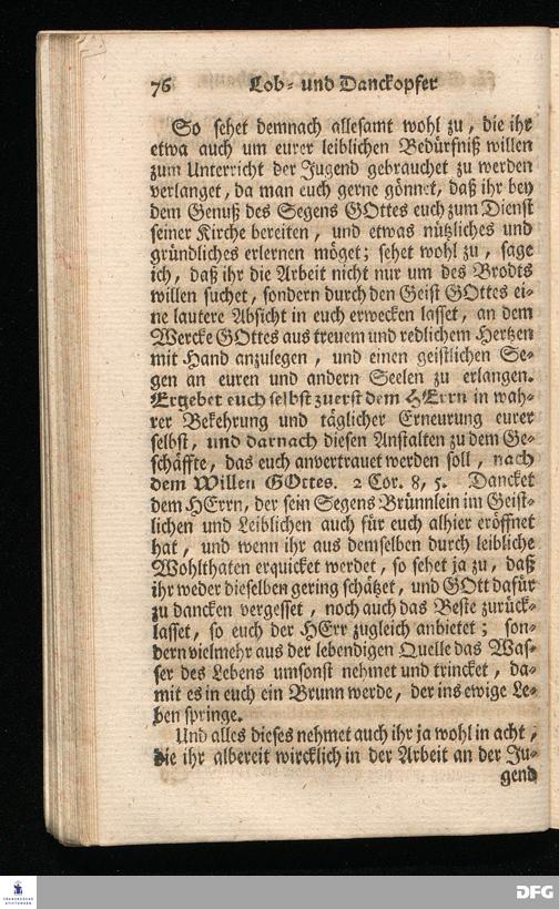Schuldiges Lob- und Danck-Opfer für die Güte und Wohlthaten Gottes, so derselbe an dem Wäysenhause zu Glaucha an Halle seitdem der Grundstein zu demselben vor funfzig Jahren geleget worden, bis hieher reichlich erzeiget hat, den 24.sten Jul. 1748.