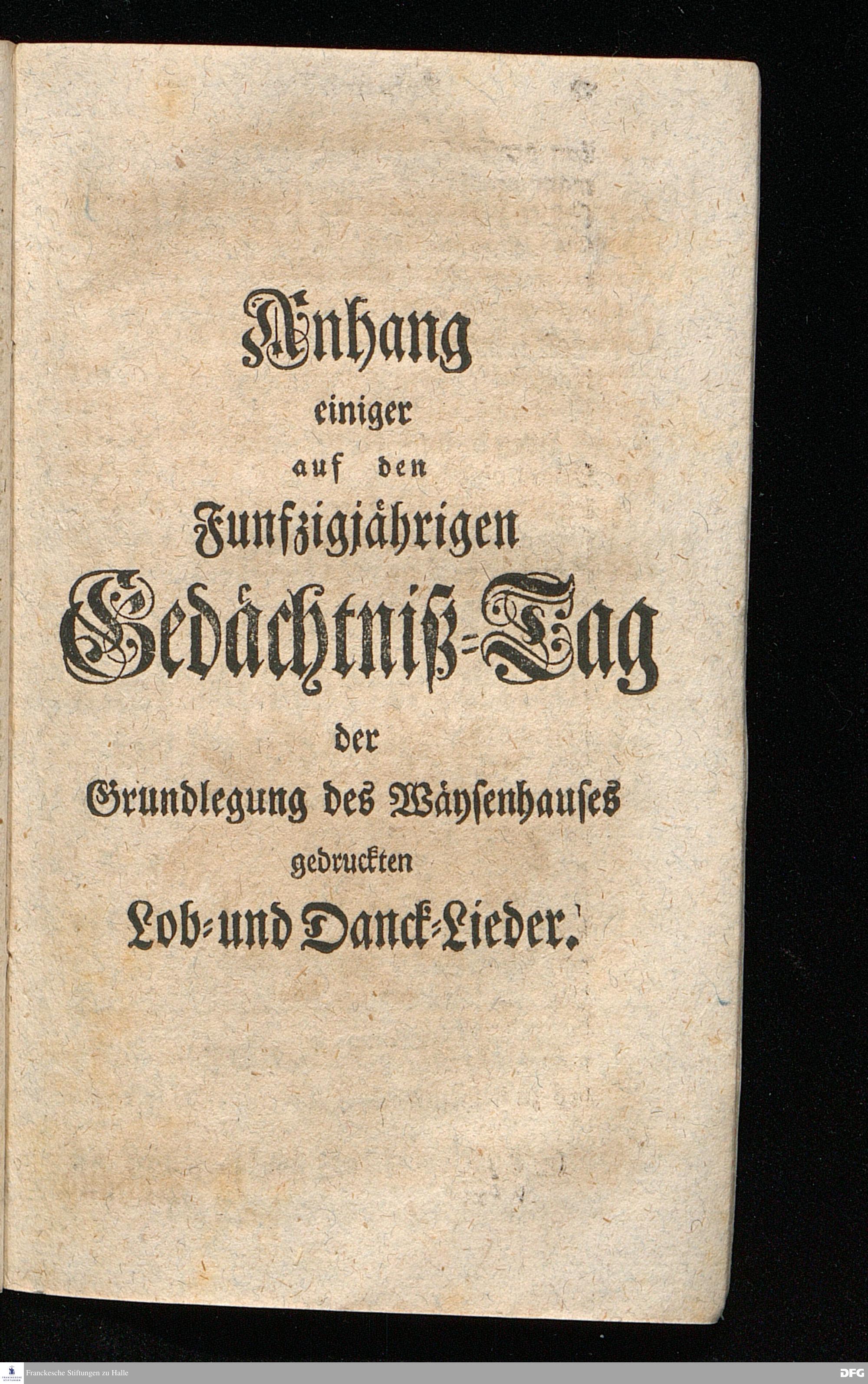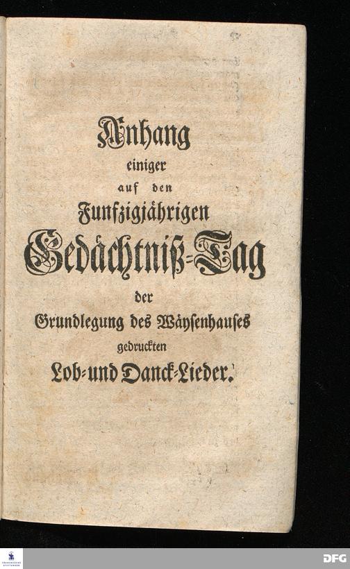 Schuldiges Lob- und Danck-Opfer für die Güte und Wohlthaten Gottes, so derselbe an dem Wäysenhause zu Glaucha an Halle seitdem der Grundstein zu demselben vor funfzig Jahren geleget worden, bis hieher reichlich erzeiget hat, den 24.sten Jul. 1748.
