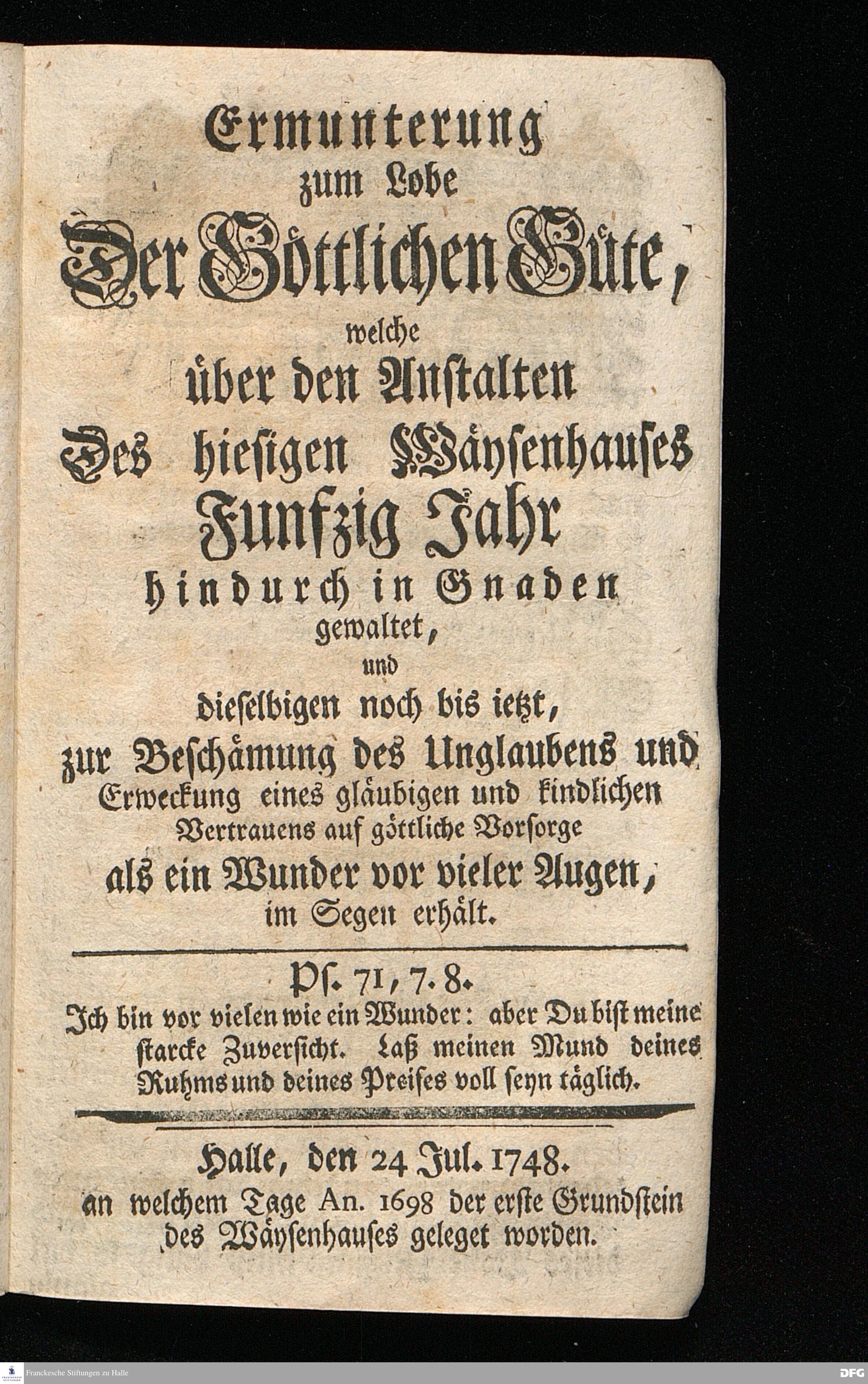 Schuldiges Lob- und Danck-Opfer für die Güte und Wohlthaten Gottes, so derselbe an dem Wäysenhause zu Glaucha an Halle seitdem der Grundstein zu demselben vor funfzig Jahren geleget worden, bis hieher reichlich erzeiget hat, den 24.sten Jul. 1748.