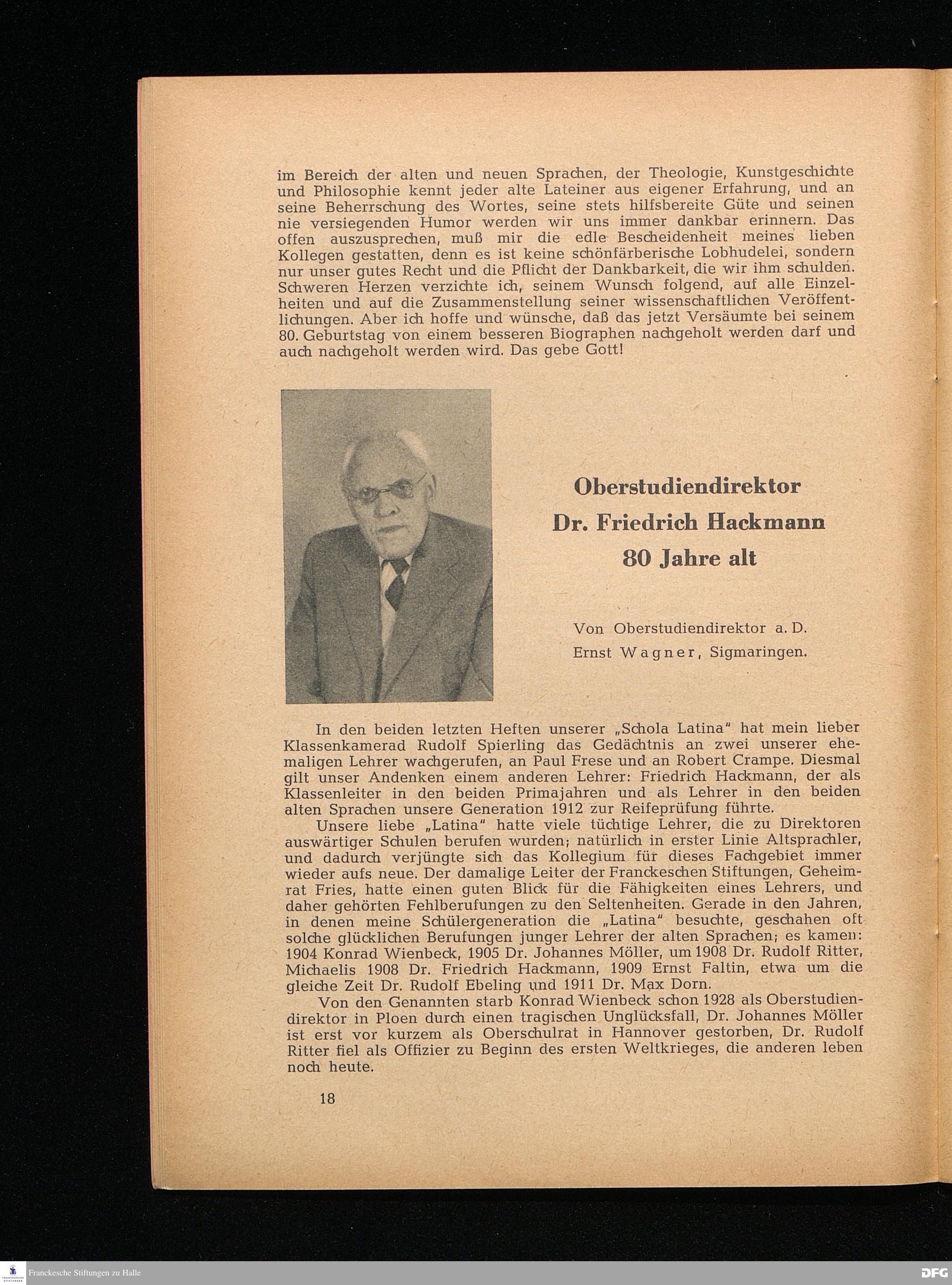 Oberstudiendirektor Dr. Friedrich Hackmann 80 Jahre alt
