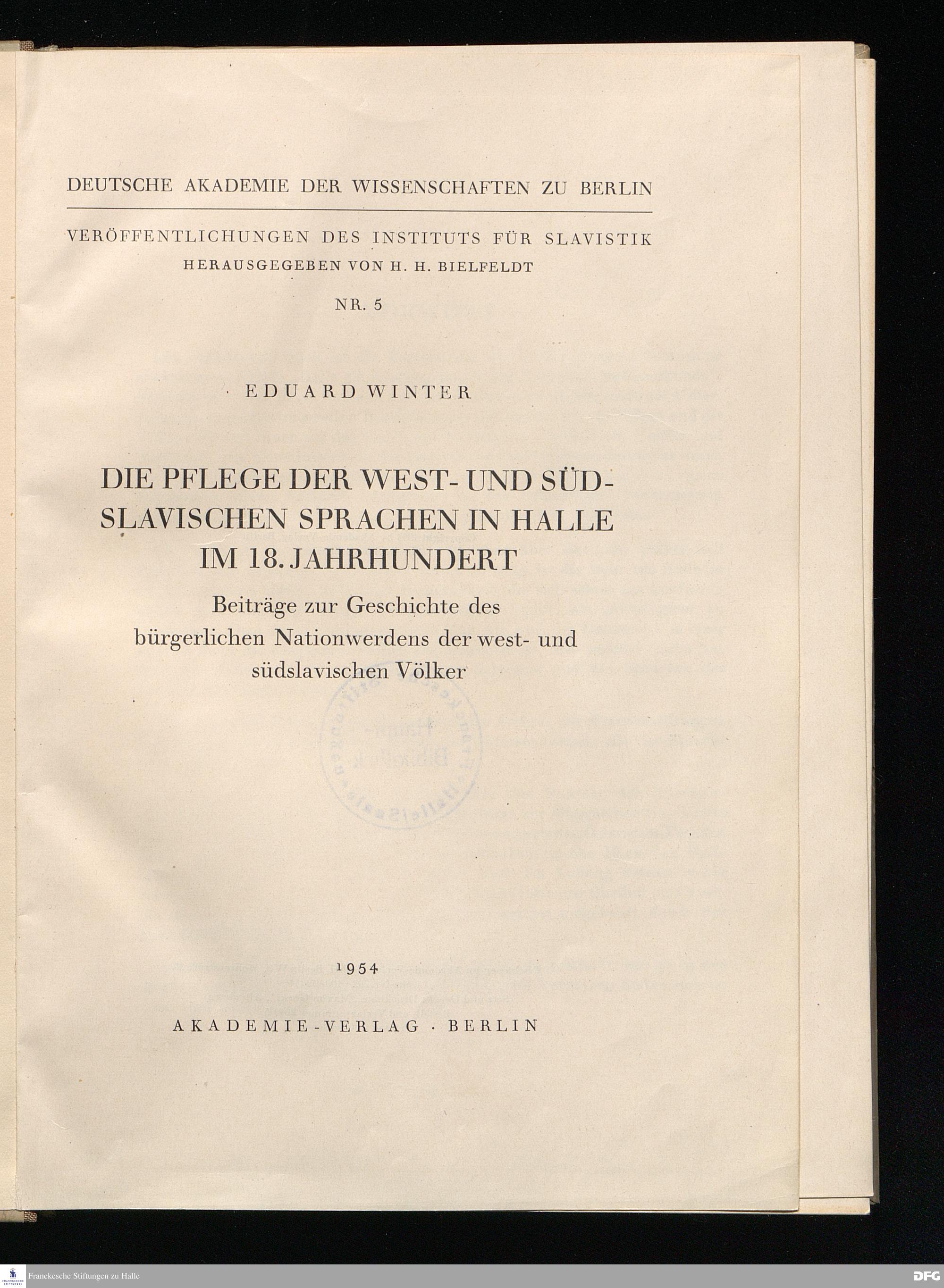 Die Pflege der west- und südslavischen Sprachen in Halle im 18. Jahrhundert. Beiträge zur Geschichte des bürgerlichen Nationwerdens der west- und südslavischen Völker.
