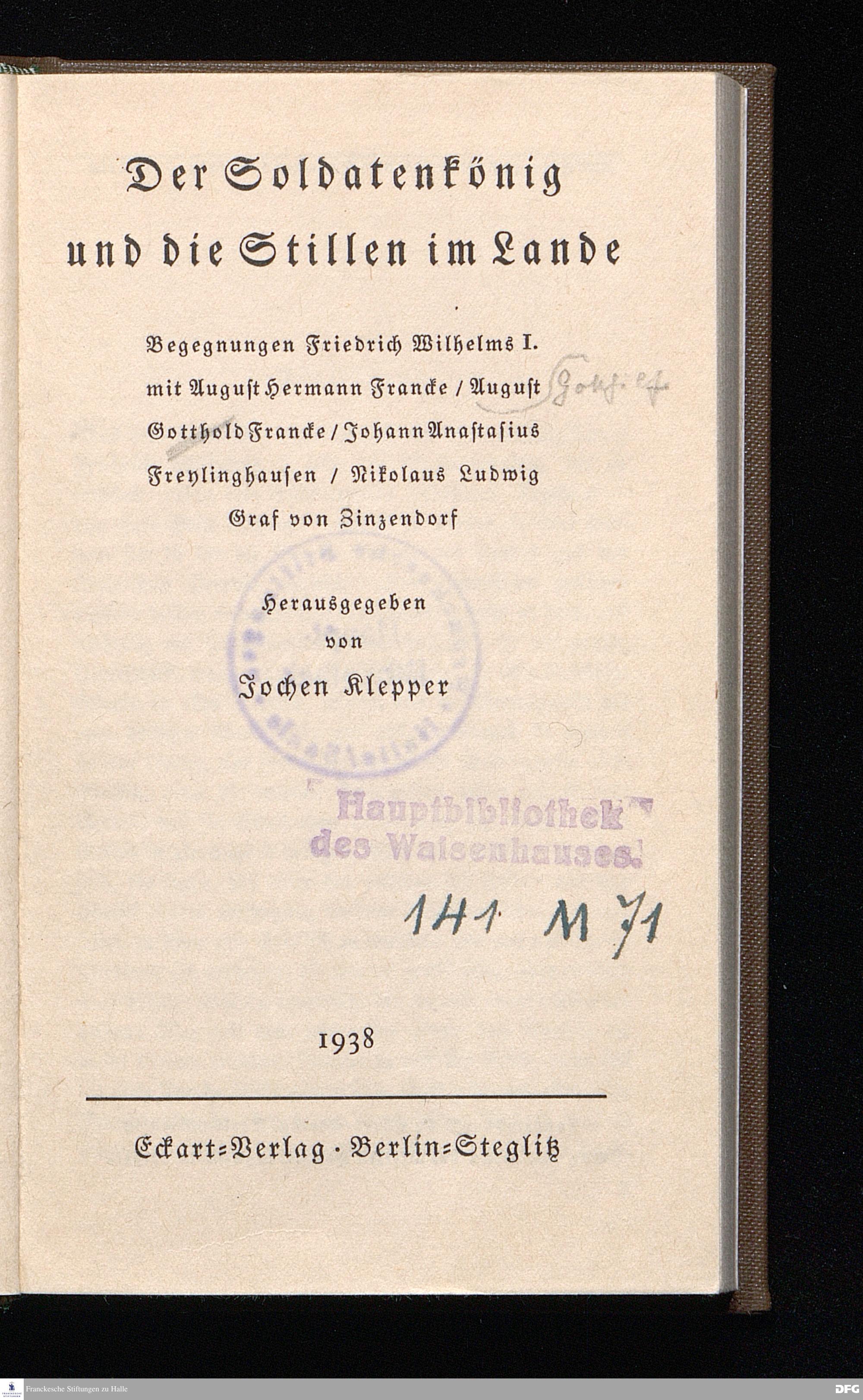Der Soldatenkönig und die Stillen im Lande. Begegnungen Friedrich Wilhelms I. mit August Hermann Francke, Gotthilf August Francke, Johann Anastasius Freylinghausen, Nikolaus Ludwig Graf von Zinzendorf.