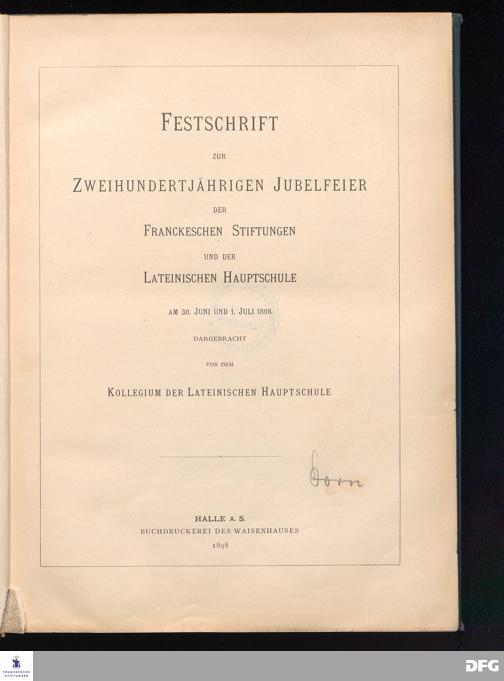 Festschrift zur zweihundertjährigen Jubelfeier der Franckeschen Stiftungen und der Lateinischen Hauptschule am 30. Juni und 1. Juli 1898.