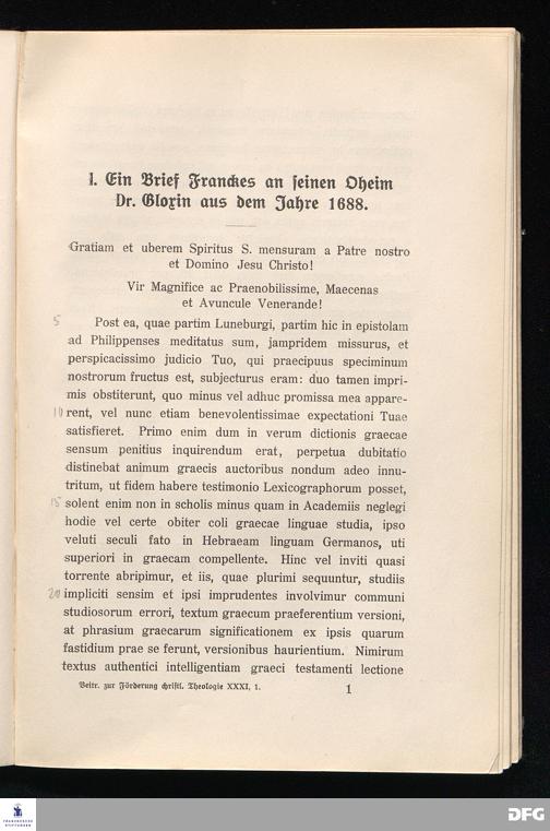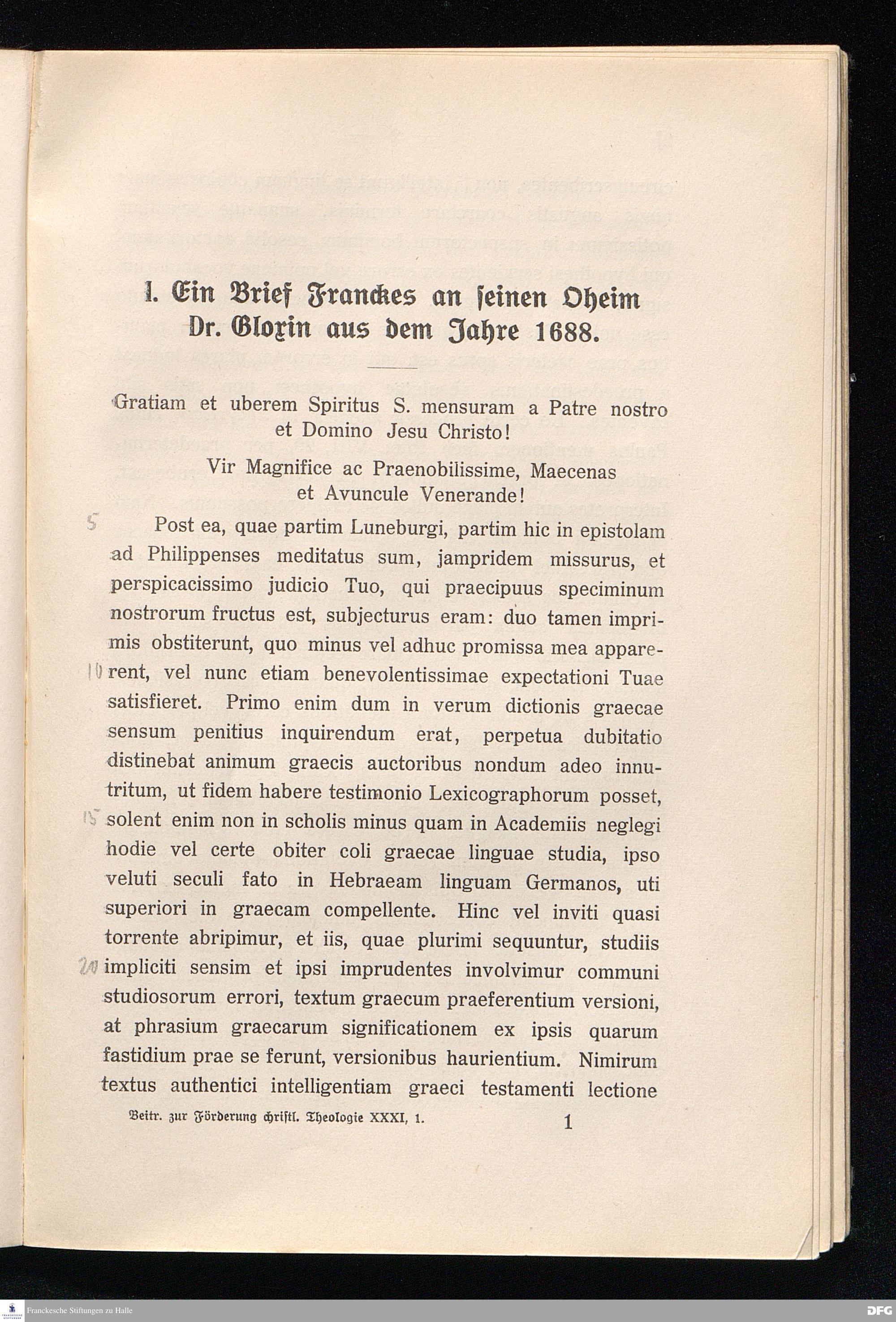 I. Ein Brief Franckes an seinen Oheim Dr. Gloxin aus dem Jahre 1688.