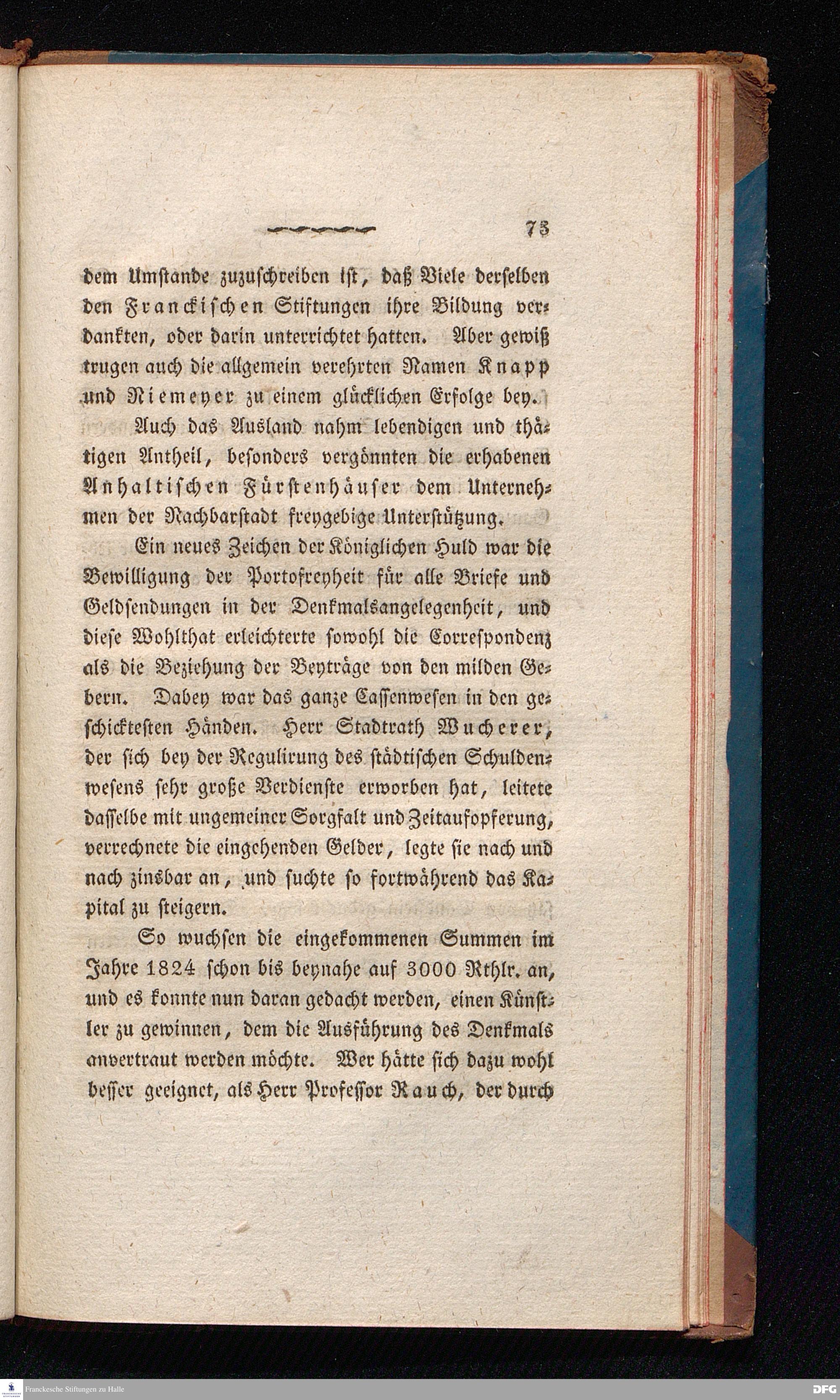 Actenmäsziger Bericht über das dem Gründer des Hallischen Waisenhauses August Hermann Francke errichtete Denkmal. Nebst einer chronologischen Darstellung seines Lebens und Wirkens und der bey der Enthüllung des Standbildes gehaltenen Einweihungs-Rede.